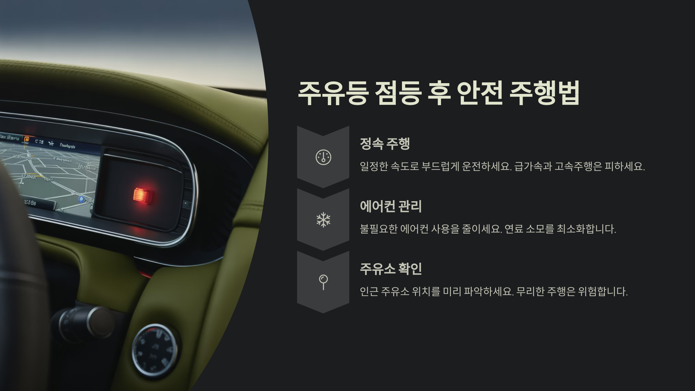 주유등이 켜지는 시점은 주행 상황에 따라서도 달라질 수 있어요. 급가속이나 급제동을 할 때는 연료탱크 내부의 연료가 앞뒤로 움직이면서 센서 값이 일시적으로 변동될 수 있거든요. 그래서 때로는 주유등이 깜빡이거나, 평지에서는 꺼져 있다가 오르막길에서 갑자기 켜지는 경우도 있어요. 이런 현상은 정상적인 것이니까 너무 걱정하지 마세요.