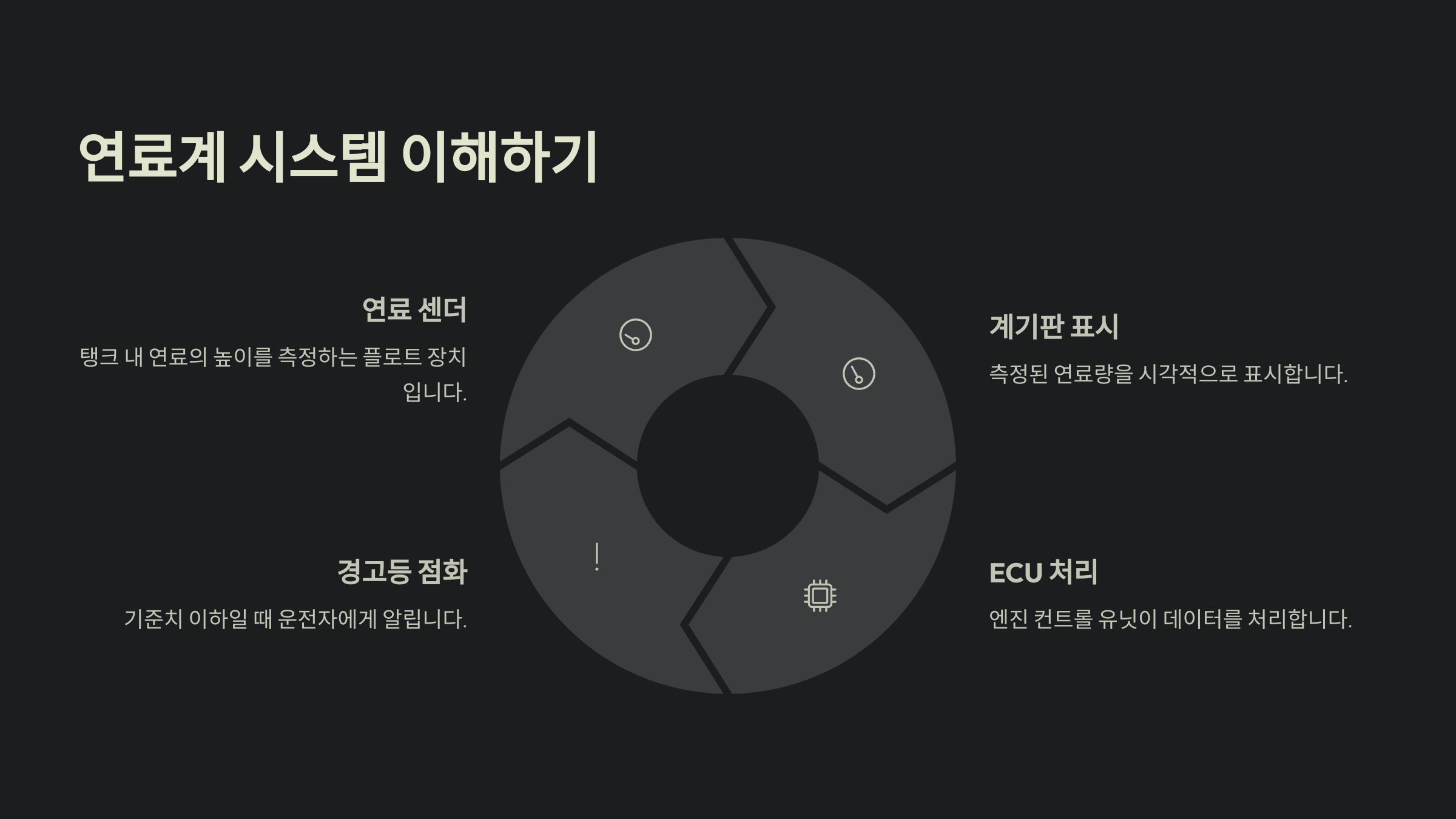 자동차 연료계 시스템의 구조를 이해하면 주유등의 작동 원리와 연료 관리를 더 잘 할 수 있어요. 연료계는 크게 연료탱크, 연료 센서, 연료 펌프, 연료 필터, 인젝터로 구성되어 있답니다. 이 중에서 연료량 측정에 직접적으로 관여하는 부품은 연료 센서인데, 이 센서가 바로 주유등 점등 여부를 결정하는 핵심 부품이에요.