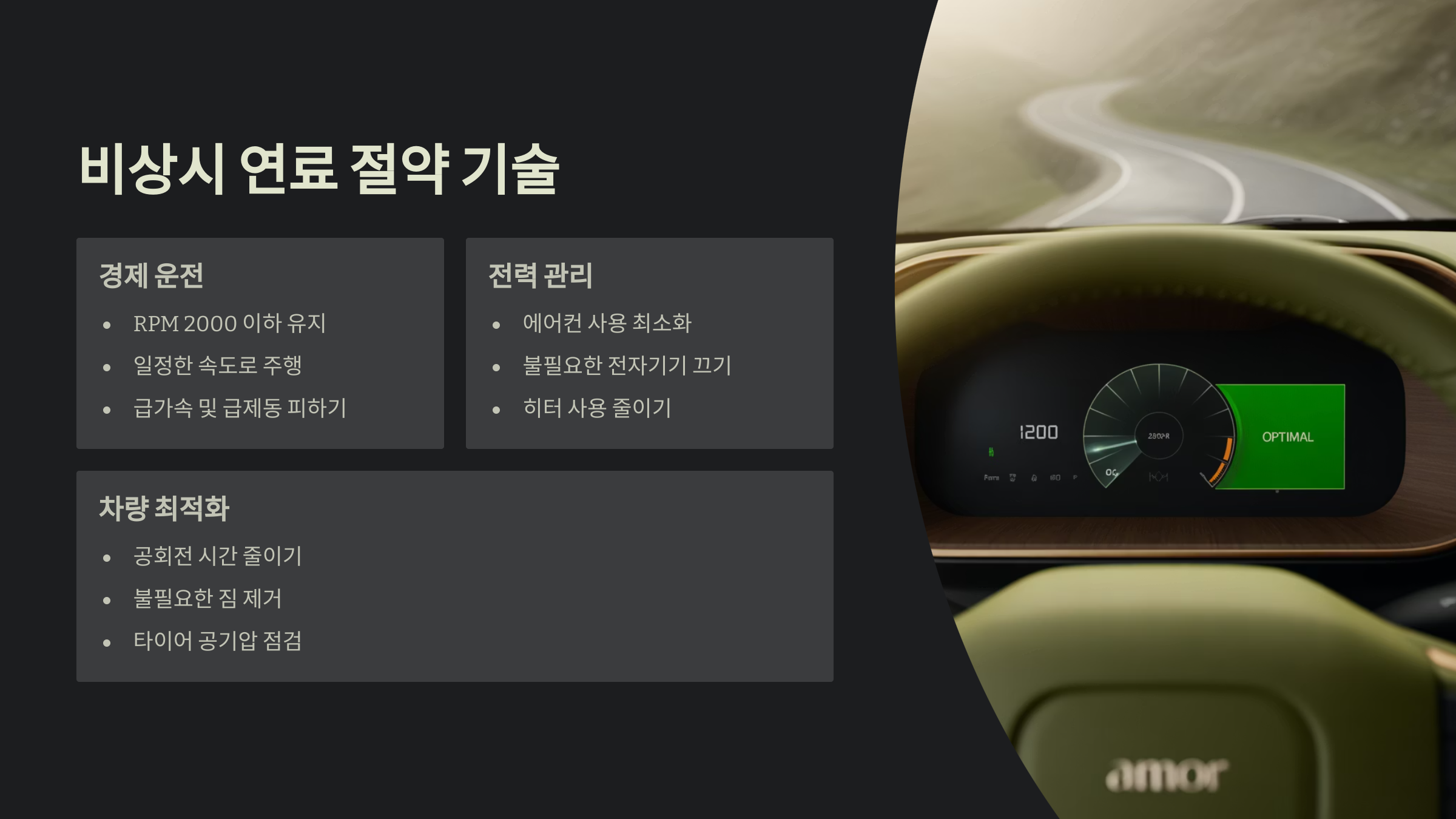 주유등이 켜진 비상 상황에서는 모든 운전 기술을 동원해서 연료를 최대한 절약해야 해요. 가장 기본적인 방법은 관성 주행을 적극 활용하는 것이에요. 내리막길이나 평지에서는 가속 페달에서 발을 떼고 차량의 관성을 이용해서 굴러가도록 하세요. 이때 엔진 브레이크를 활용하면 연료 분사가 중단되어서 연료 소모를 최소화할 수 있어요. 단, 엔진이 완전히 꺼지지 않도록 주의해야 해요.