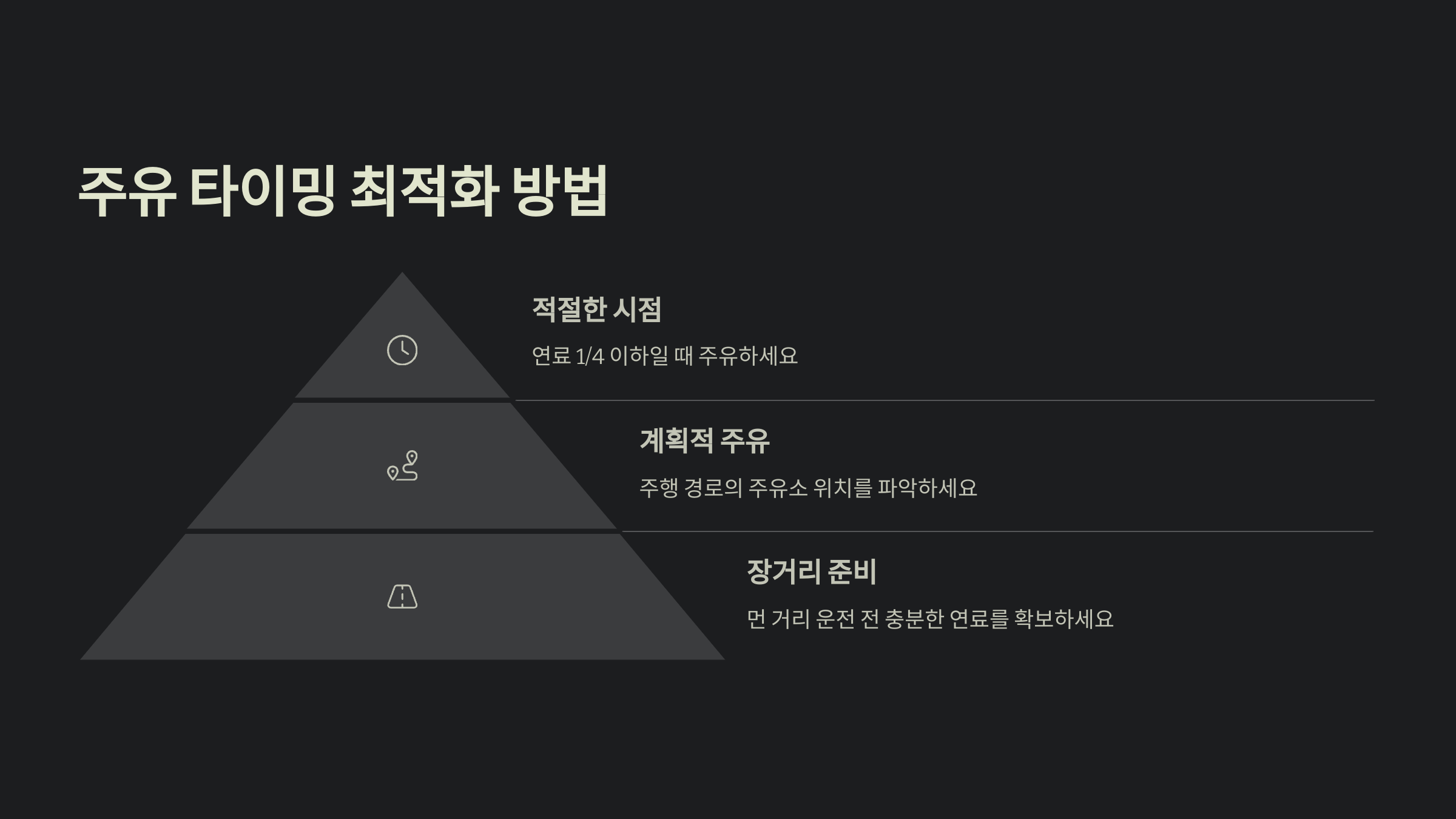 효율적인 주유 타이밍을 찾으면 연료비를 절약하고 차량 관리도 더 잘할 수 있어요. 일반적으로 연료게이지가 1/4 지점에 도달했을 때 주유하는 것이 가장 좋다고 알려져 있어요. 이 시점에서 주유하면 연료 펌프에 무리를 주지 않으면서도 연료탱크 바닥의 침전물이나 수분이 엔진으로 유입되는 것을 막을 수 있답니다. 연료가 너무 적으면 탱크 바닥의 불순물이 함께 빨려 올라갈 위험이 있어요.