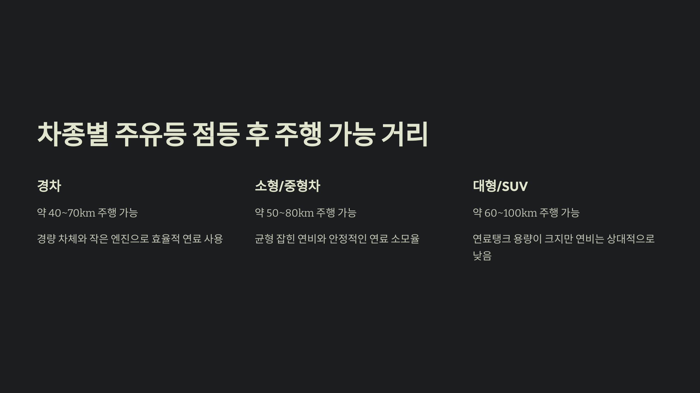 A1. 차종에 따라 다르지만 일반적으로 경차는 30-50km, 소형차는 50-70km, 중형차는 60-90km, 대형차/SUV는 80-120km 정도 추가 주행이 가능해요. 하지만 운전 습관, 도로 상황, 차량 상태에 따라 실제 거리는 달라질 수 있으니 여유를 두고 주유소를 찾는 것이 안전해요.
