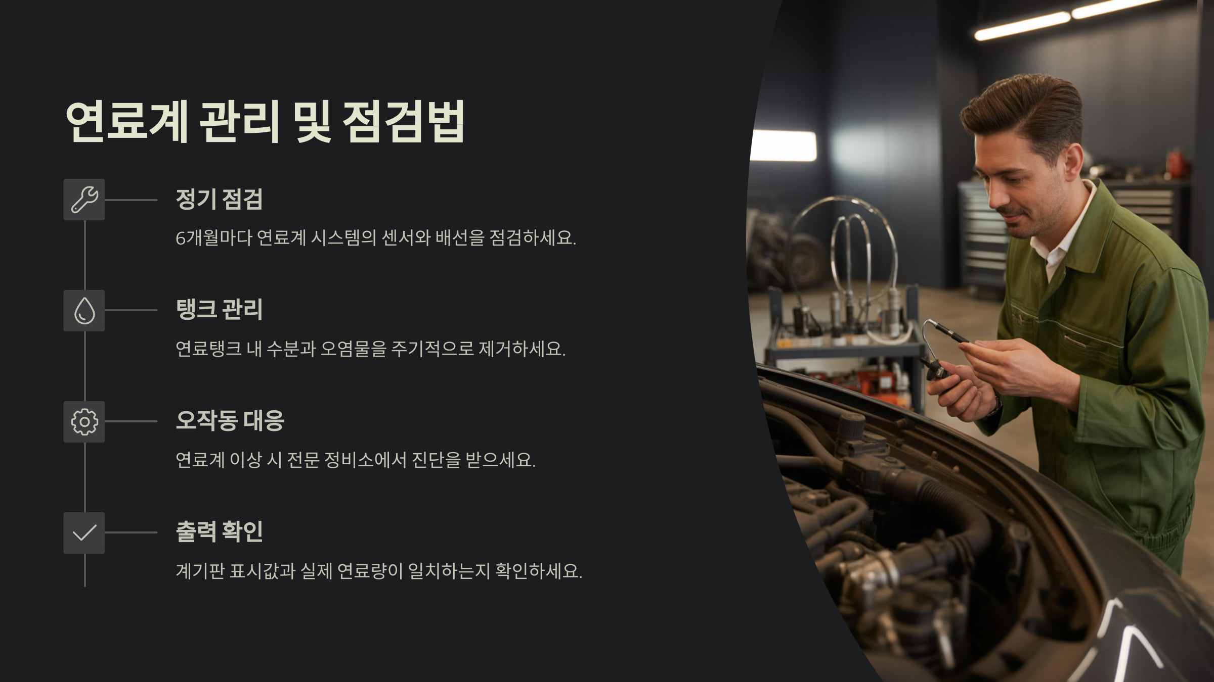연료 센서의 정확도도 주기적으로 확인해보는 것이 좋아요. 연료를 가득 채운 상태에서 연료계가 완전히 가득 찬 것으로 표시되는지, 연료가 떨어졌을 때 주유등이 적절한 시점에 켜지는지 체크해보세요. 만약 연료계 표시가 실제와 크게 다르다면 연료 센서나 계기판에 문제가 있을 수 있으니 정비소에서 점검받는 것이 좋아요. 특히 오래된 차량은 센서 노화로 인해 부정확한 표시가 나타날 수 있어요.