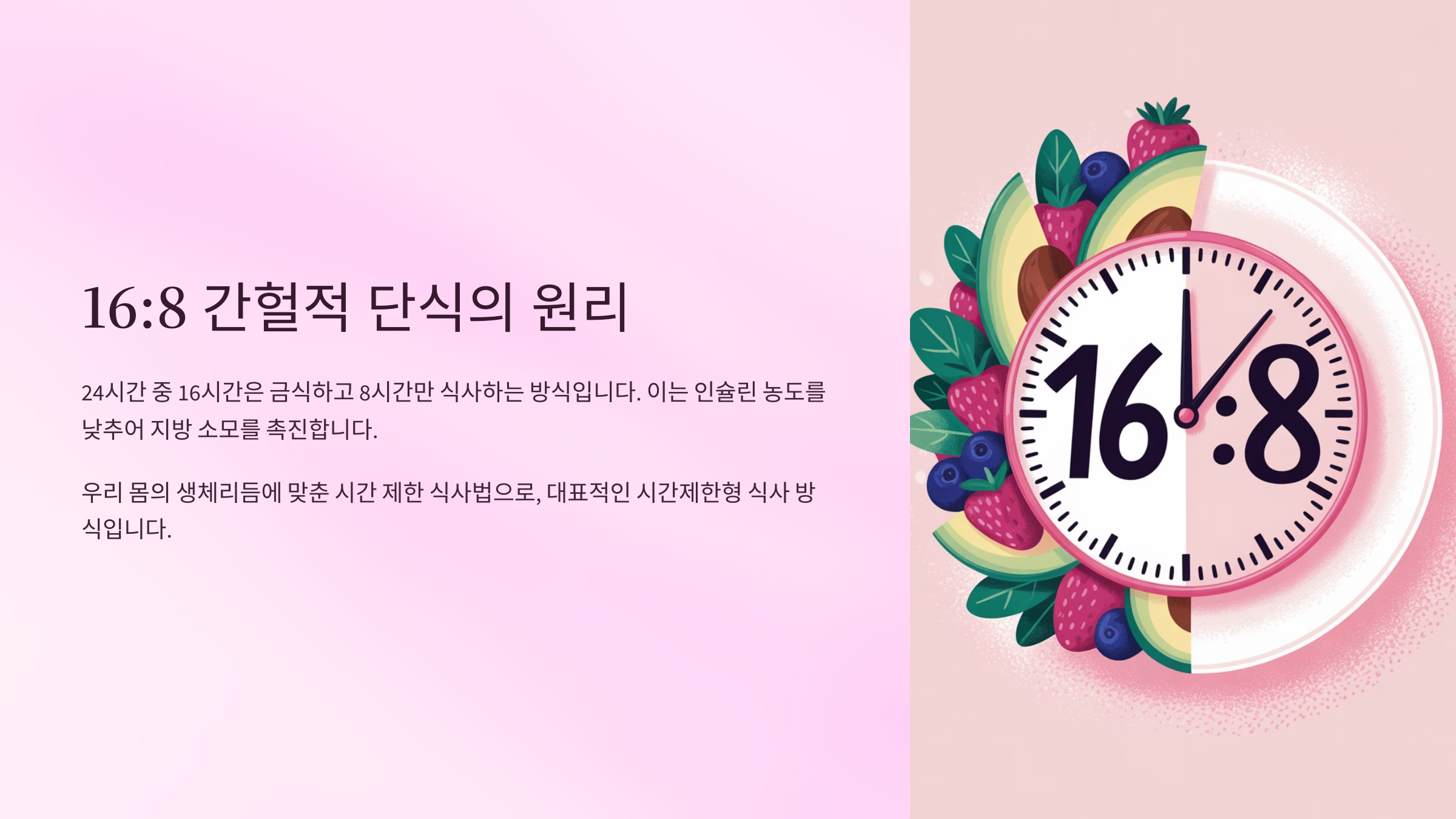 16:8 간헐적 단식은 하루 24시간 중 16시간은 금식하고 8시간 동안만 음식을 섭취하는 다이어트 방법이에요. 가장 인기 있고 실천하기 쉬운 간헐적 단식법으로, 전 세계 수많은 사람들이 체중 감량과 건강 개선을 위해 시도하고 있답니다. 특히 바쁜 현대인들에게 적합한 방법으로 알려져 있어요.