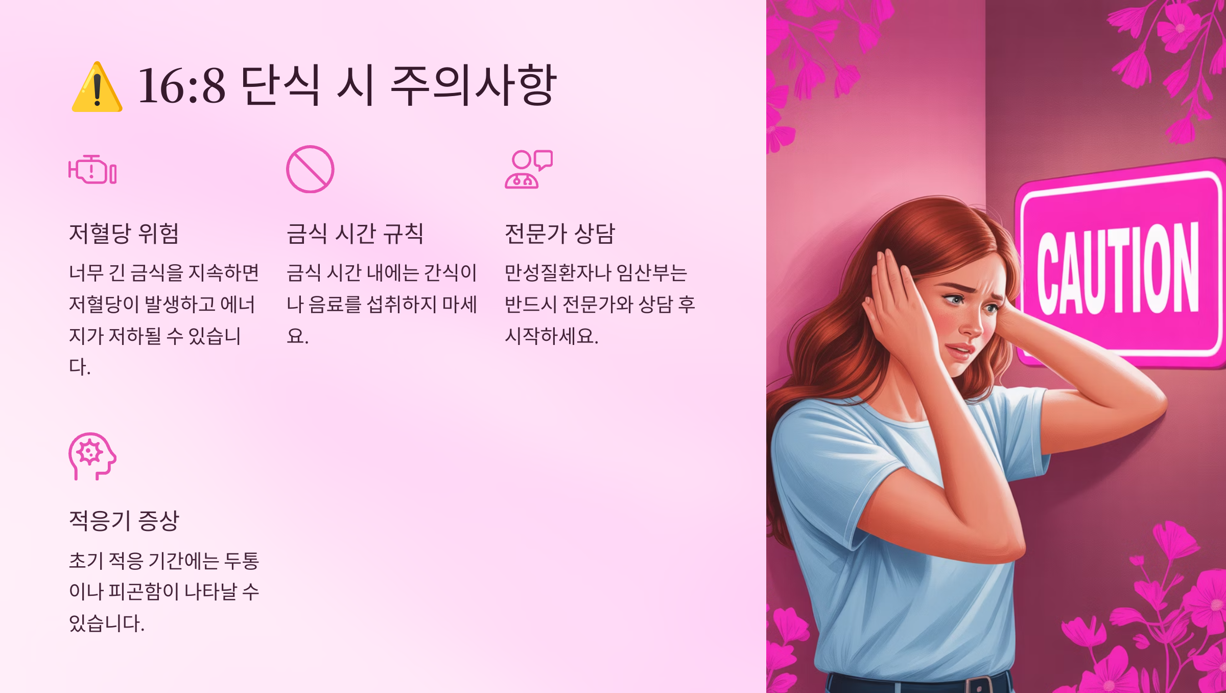 16:8 간헐적 단식은 안전한 방법이지만 모든 사람에게 적합한 것은 아니에요. 당뇨병 환자, 임산부, 수유부, 섭식장애 병력이 있는 사람, 18세 미만의 청소년은 반드시 의사와 상담 후 시작해야 해요. 특히 당뇨병 치료제나 혈압약을 복용하고 있다면 약물 조절이 필요할 수 있으니 전문의와 충분히 논의하는 것이 중요해요. 또한 과거에 거식증이나 폭식증 같은 섭식장애를 경험했다면 16:8 단식이 증상을 악화시킬 수 있으니 주의가 필요하답니다.