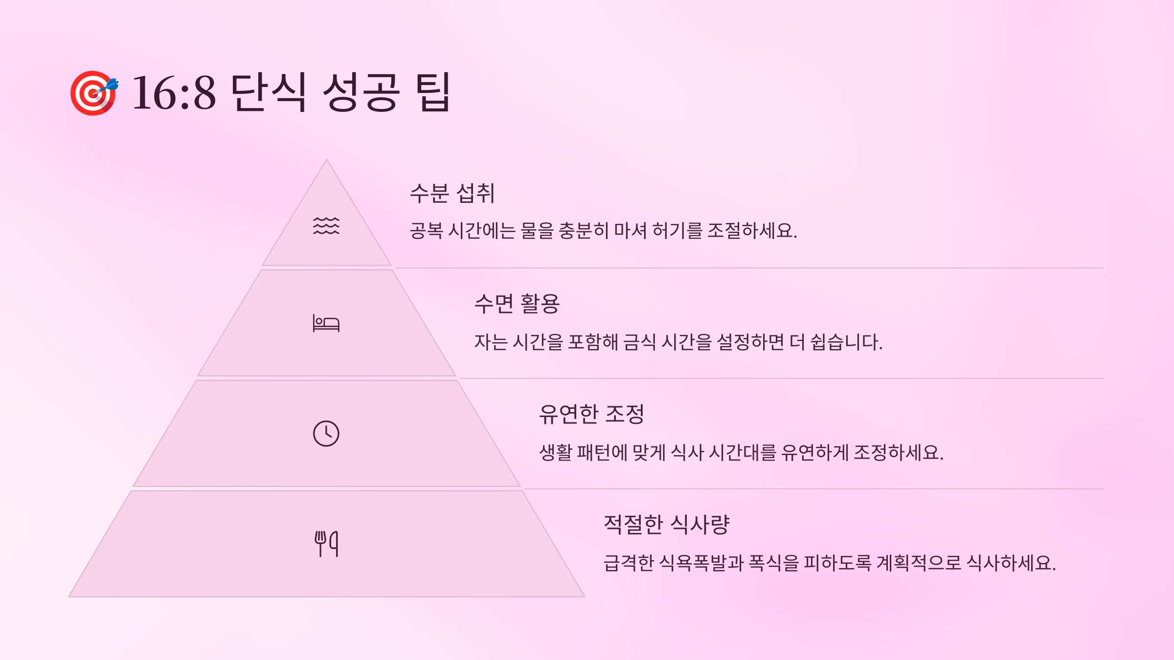 스트레스 관리도 16:8 단식 성공에 핵심적인 요소예요. 스트레스를 받으면 코르티솔 호르몬이 분비되면서 식욕이 증가하고 특히 단 음식에 대한 욕구가 강해져요. 이럴 때는 심호흡, 명상, 요가, 마사지 등으로 스트레스를 해소하는 것이 중요해요. 또한 16:8 단식 자체가 스트레스가 되지 않도록 너무 완벽하게 하려고 하지 말고, 가끔 실수하더라도 자책하지 말고 다시 시작하는 마음가짐이 필요해요. 단식은 평생 지속할 건강한 생활습관이어야 하니까 무리하지 않는 것이 가장 중요하답니다.