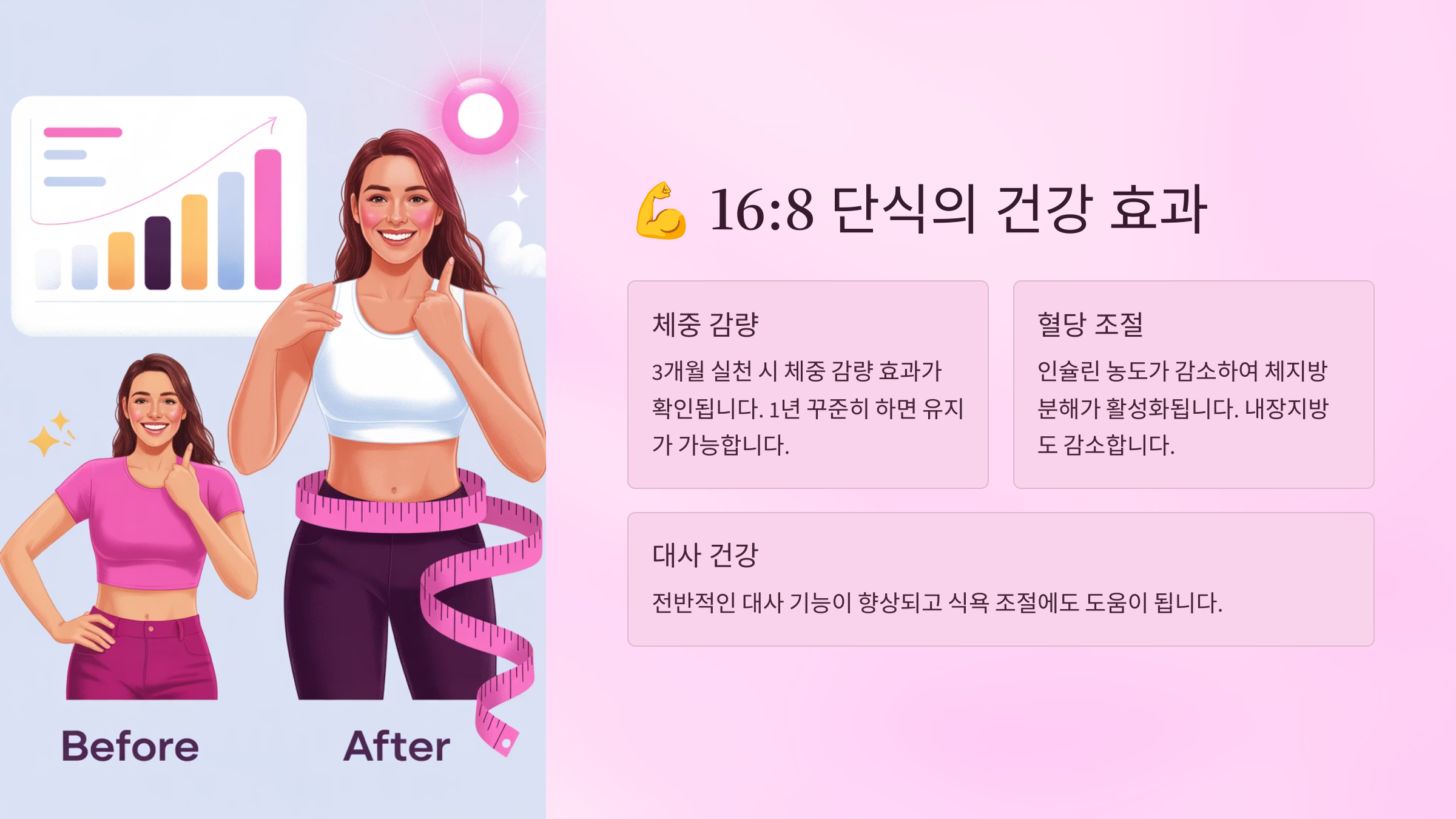 16:8 간헐적 단식의 가장 대표적인 효과는 체중 감량이에요. 연구에 따르면 16:8 방법을 8주간 실천한 사람들이 평균 3-8% 정도의 체중 감량 효과를 경험했다고 해요. 이는 단순히 칼로리 제한만으로는 달성하기 어려운 수준의 효과랍니다. 특히 복부 지방 감소에 탁월한 효과가 있어서 내장지방으로 고민하는 사람들에게 큰 도움이 되고 있어요. 체중 감량과 함께 체지방률도 현저히 감소하면서 전반적인 체성분 개선 효과를 볼 수 있답니다.
