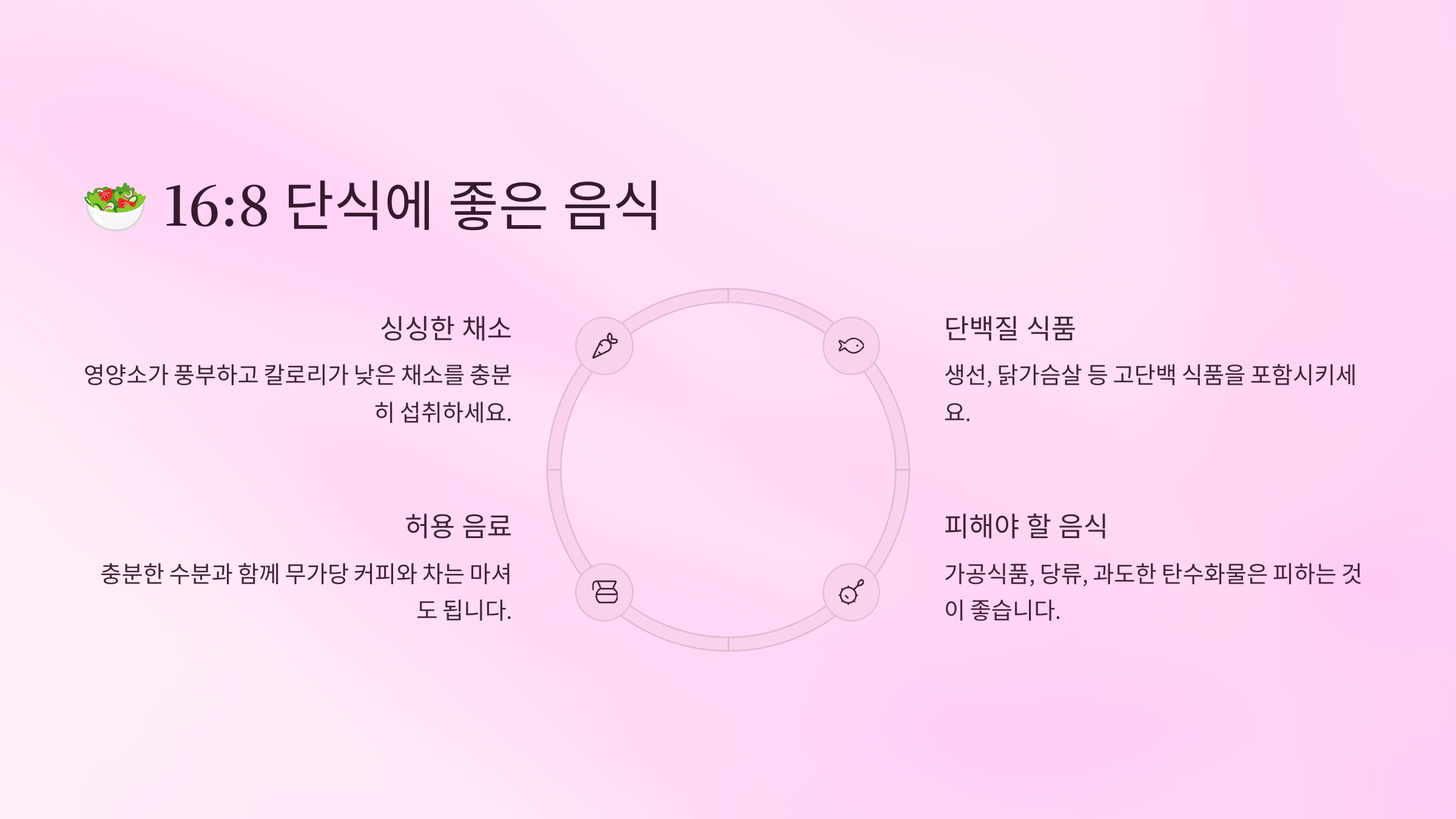 | 메인 식사 | 연어, 현미, 채소 | 튀김, 패스트푸드 |