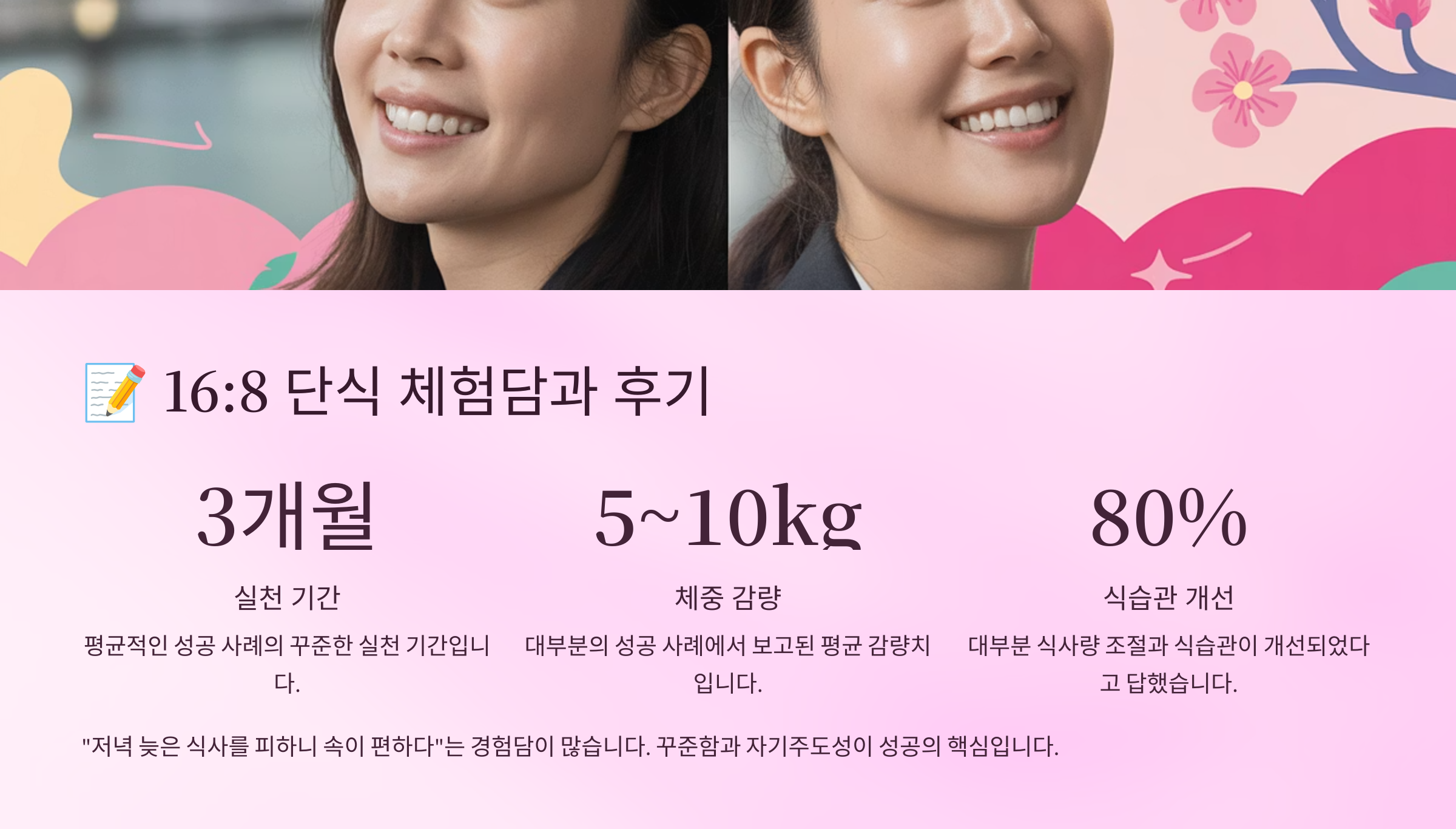 실제로 16:8 간헐적 단식을 실천한 사람들의 후기를 살펴보면 대부분 긍정적인 경험을 하고 있어요. 30대 직장인 김모씨는 "처음에는 아침을 거르는 게 힘들었지만, 2주 정도 지나니까 자연스럽게 적응됐어요. 3개월 동안 7kg을 감량했고, 무엇보다 오후에 졸리던 증상이 완전히 사라진 게 가장 좋았어요"라고 말했어요. 많은 사람들이 체중 감량뿐만 아니라 에너지 레벨 향상과 집중력 개선을 경험하고 있다는 공통점이 있답니다.