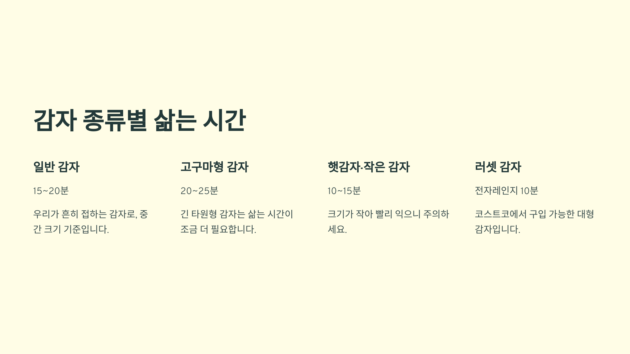 | 수미감자 | 중간 | 15-20분 | 범용성 좋음 |