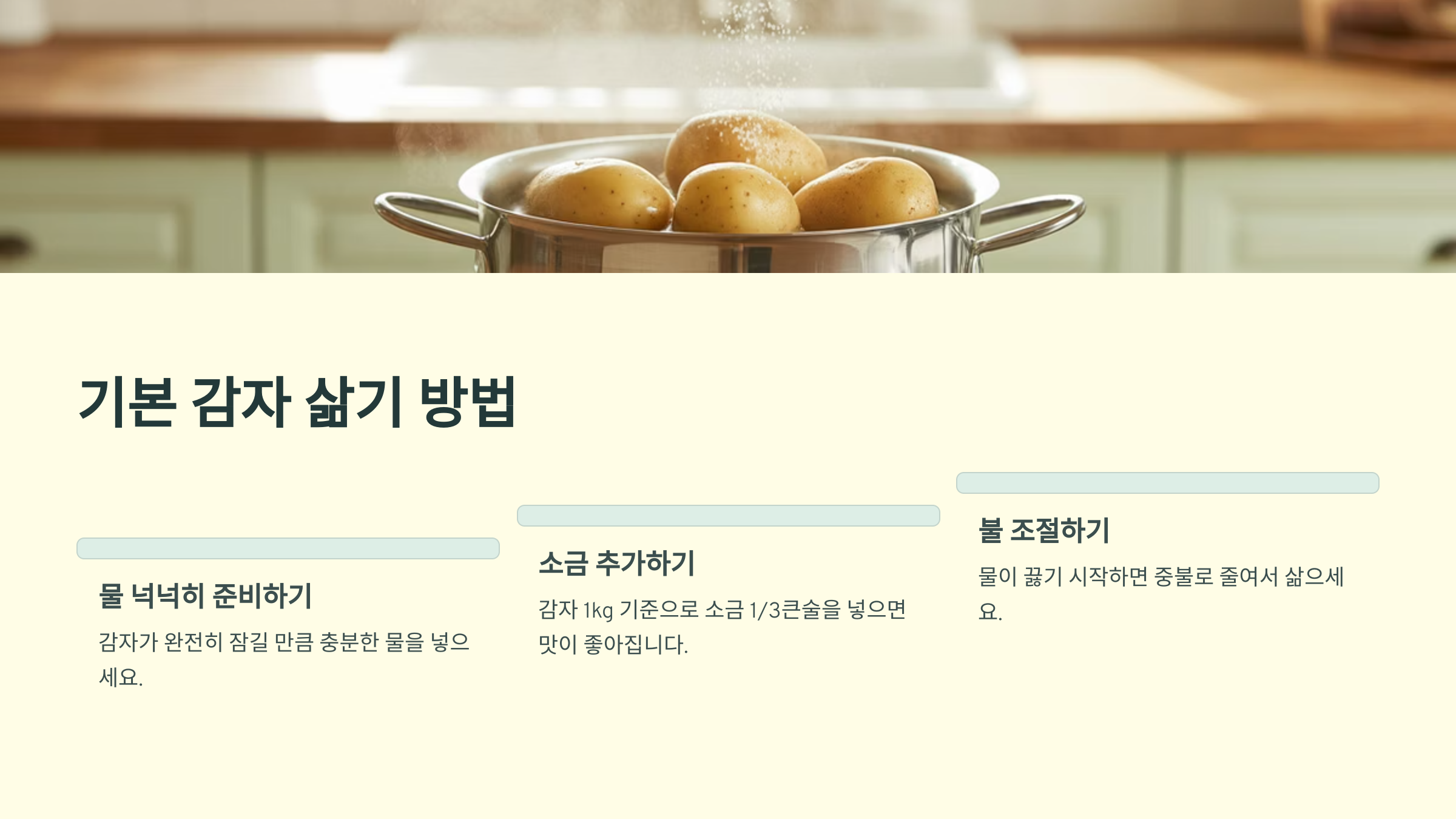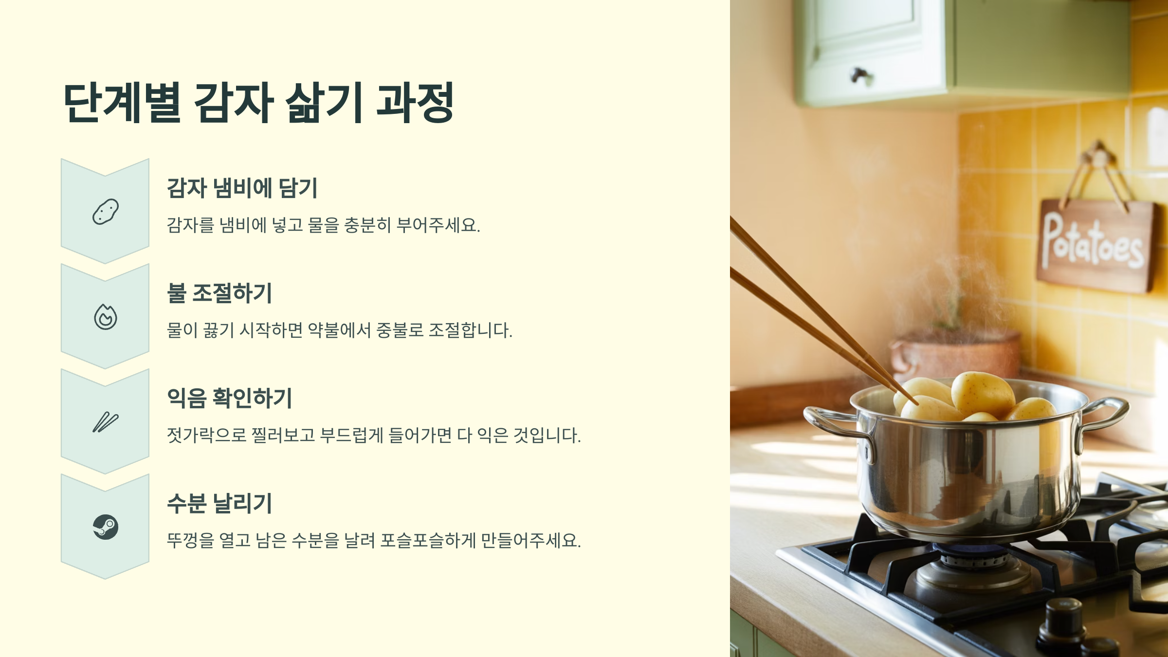 감자 삶기는 간단해 보이지만 정확한 시간과 방법을 알면 훨씬 맛있게 만들 수 있어요. 감자의 종류와 크기에 따라 삶는 시간이 달라지고, 올바른 방법으로 삶으면 부서지지 않으면서도 속까지 완전히 익은 완벽한 감자를 만들 수 있답니다. 감자요리의 기본이 되는 삶기 방법을 제대로 익혀두면 감자탕, 감자샐러드, 감자조림 등 다양한 요리에 활용할 수 있어요.