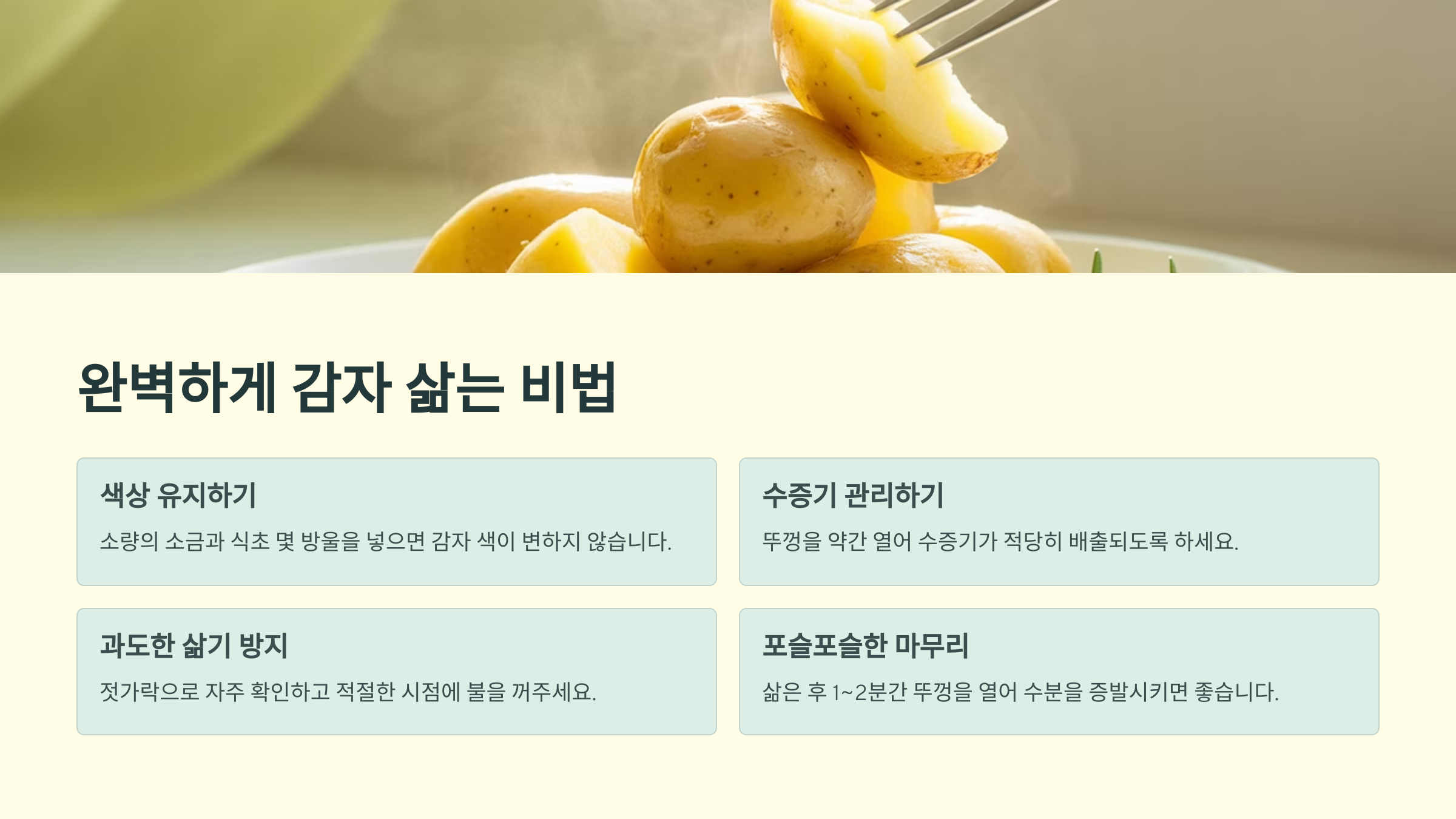 내가 생각했을 때 감자 삶기에서 가장 실수하기 쉬운 부분은 물의 온도예요. 뜨거운 물에 감자를 넣으면 겉만 빨리 익고 속은 덜 익어서 식감이 고르지 않아요. 반드시 찬물에서부터 시작해서 천천히 온도를 올려가는 것이 비결이에요. 또한 삶은 후에는 바로 찬물에 헹궈서 여열로 인한 과도한 조리를 방지하는 것도 중요해요.