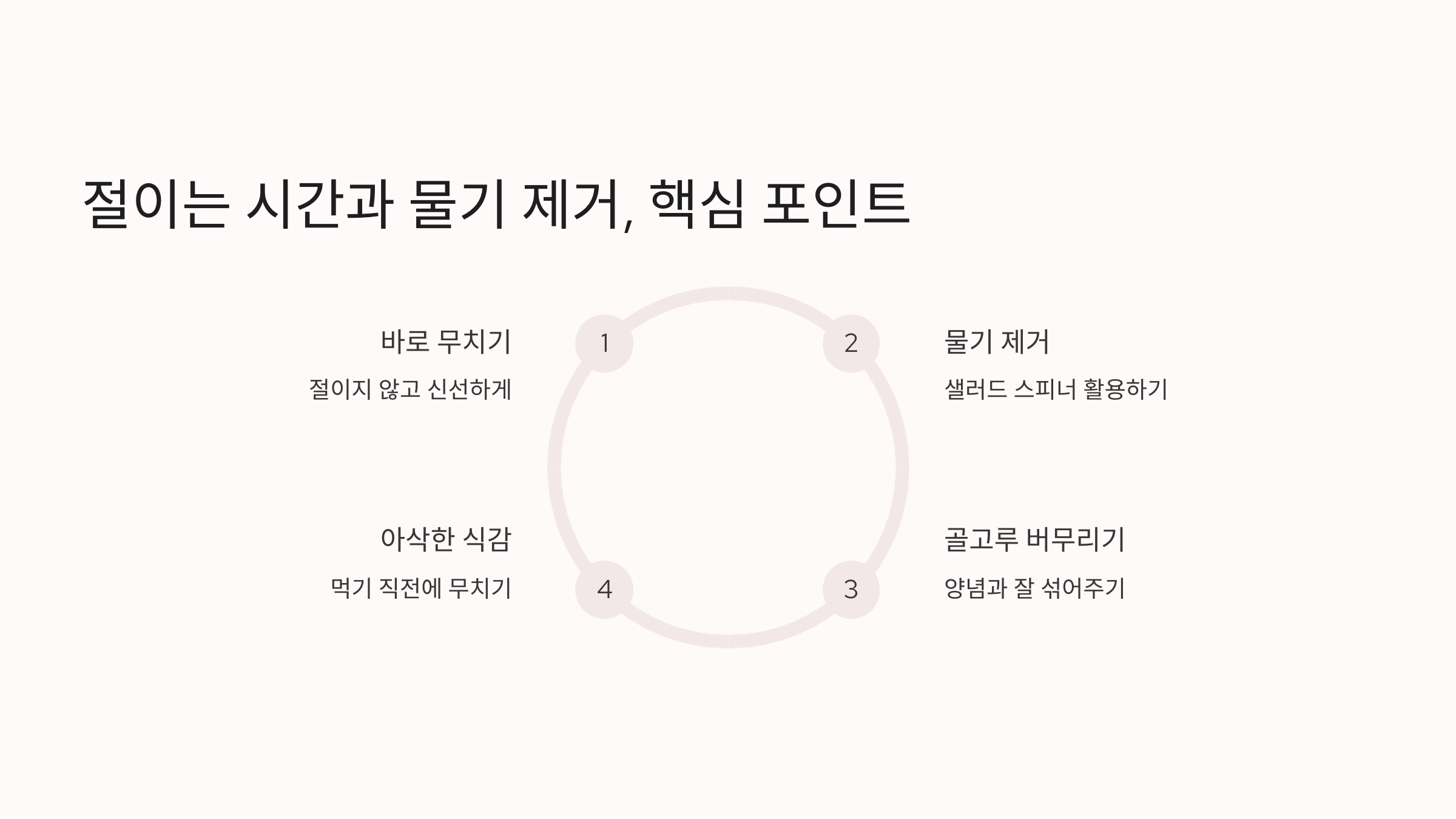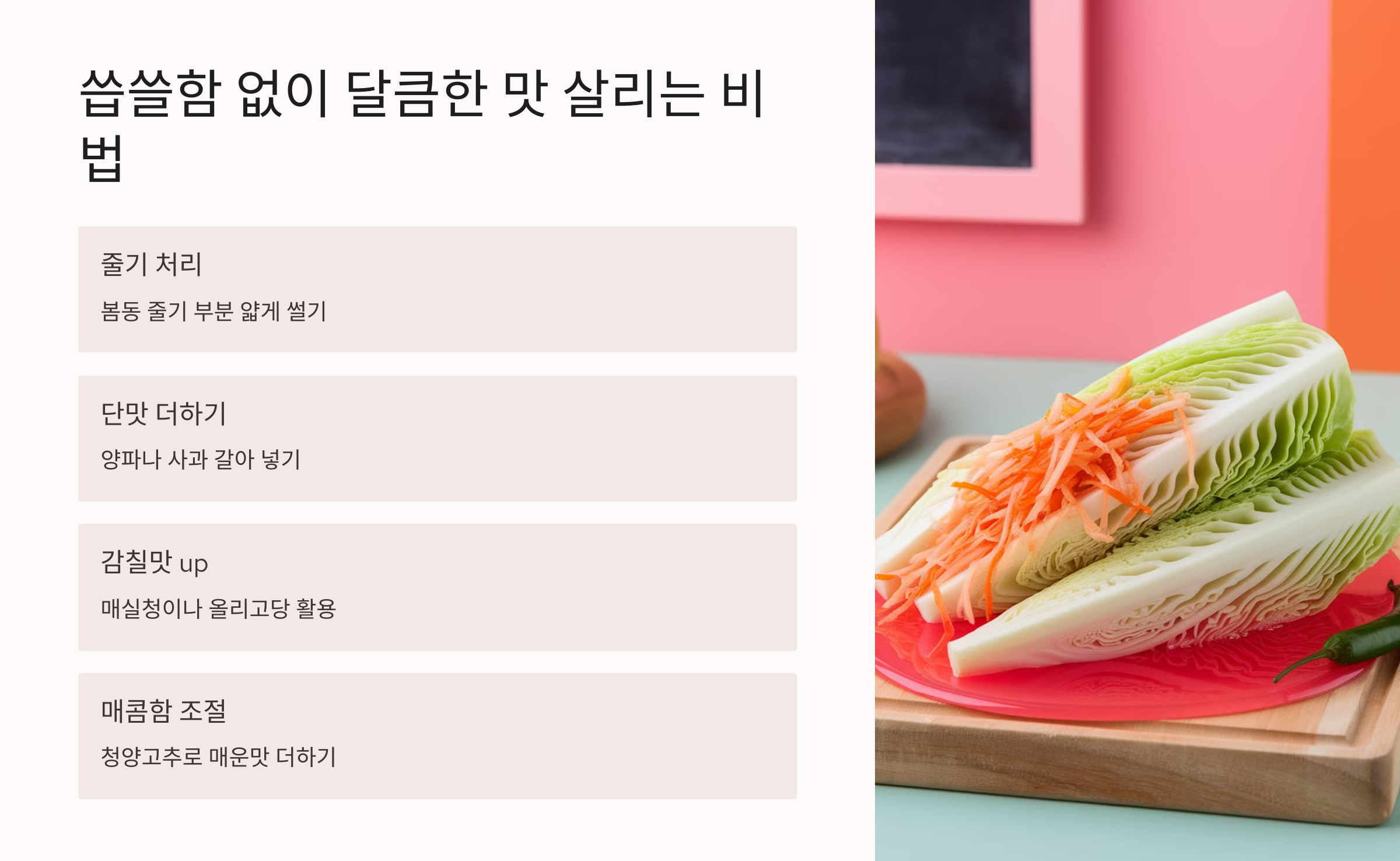 | 물기 제거 후 보관 | 남은 겉절이는 물기 제거 후 보관 | 신선함 유지 |