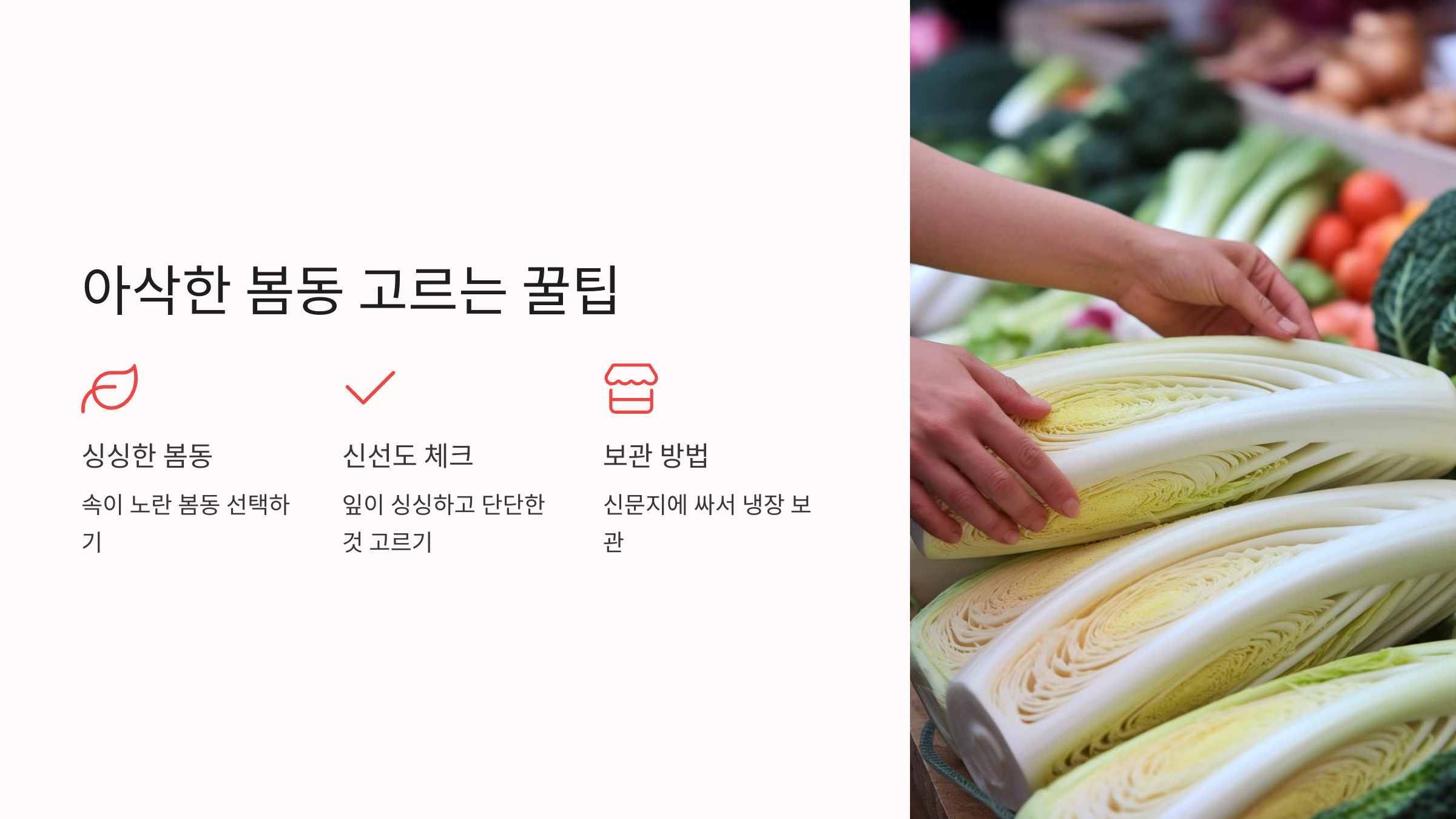 ✔ 잎이 짧고 단단한 것: 잎이 크고 흐물흐물한 봄동은 수분이 많아 아삭한 식감이 덜해요. 작고 속이 꽉 찬 봄동이 훨씬 맛있답니다.