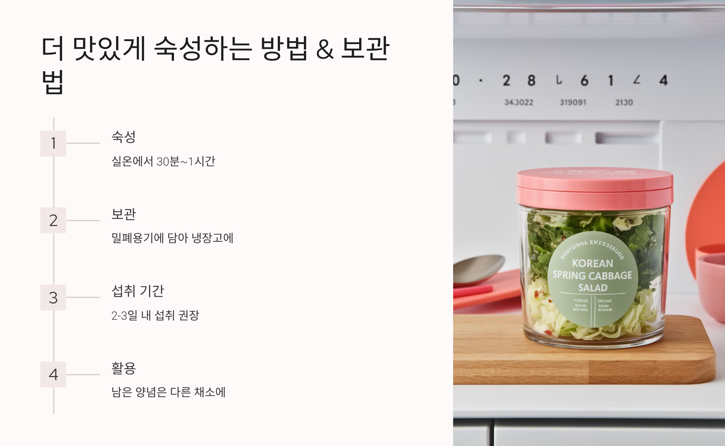 ✔ 봄동 겉절이는 바로 먹는 것이 가장 맛있어요. 하지만 보관해야 한다면 밀폐 용기에 넣고 최대 2~3일 이내에 드세요. ❄️