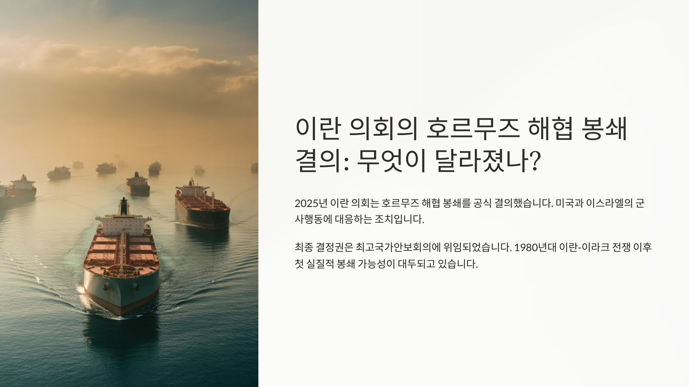 2025년 6월 22일, 전 세계가 숨죽여 지켜보는 가운데 이란 의회가 호르무즈 해협 봉쇄를 의결했어요. 미국의 이란 핵시설 공격에 대한 보복 조치로 나온 이 결정은 국제 에너지 시장에 거대한 충격파를 일으키고 있답니다. 세계 원유 수송의 20%가 통과하는 이 좁은 해협이 막힐 경우, 우리가 상상하는 것보다 훨씬 더 큰 경제적 재앙이 닥칠 수 있어요.