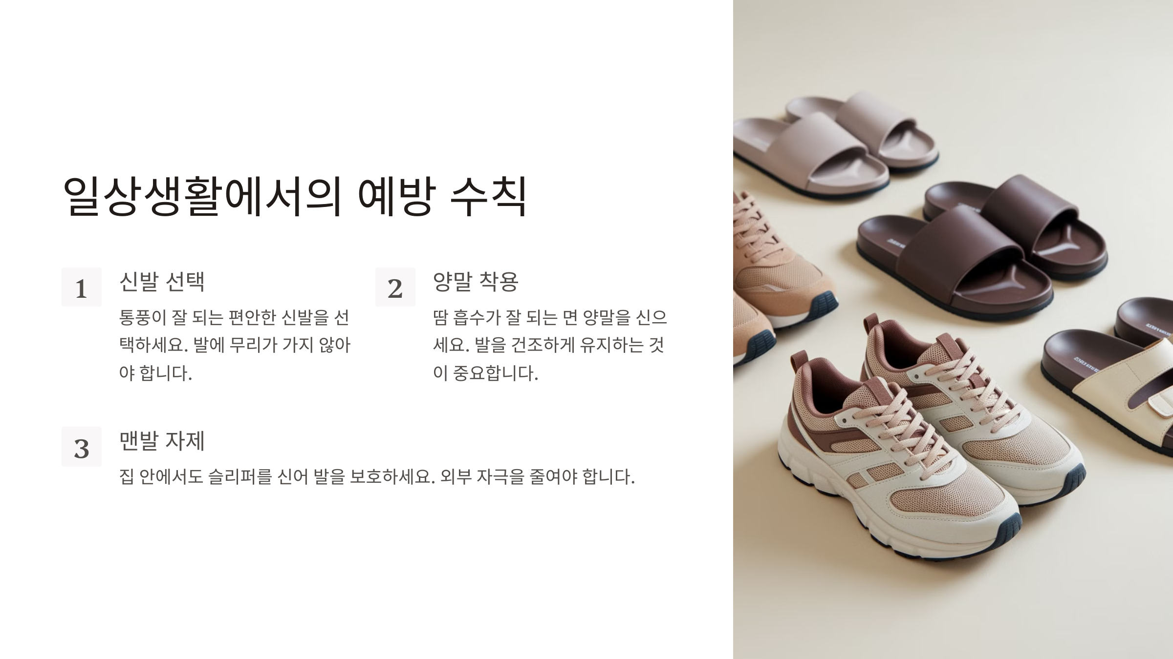 내가 생각했을 때, 이 모든 요소들이 복합적으로 작용하면서 발뒤꿈치 건강이 나빠지는 것 같아요. 그렇다면 예방하는 방법을 하나씩 알아볼까요? 😊
