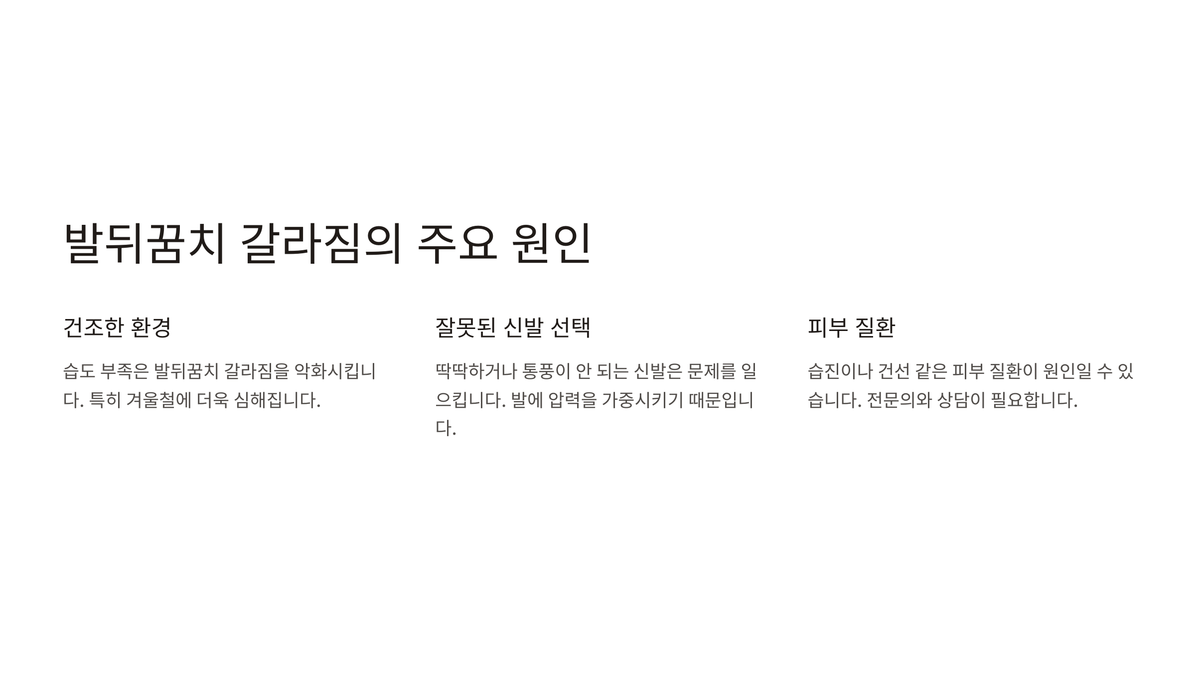 A1. 가장 큰 원인은 건조함이에요. 발은 피지선이 없어 자연적으로 보습이 되지 않기 때문에 꾸준한 보습 관리가 필요해요. 또한, 장시간 서 있거나 영양 부족, 신발 선택도 영향을 줘요.