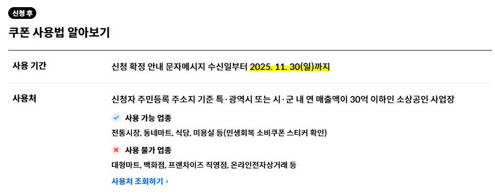 연 매출 30억원 이하 매장에서만 사용 가능해요. 쉽게 말해서 동네 가게들은 거의 다 된다고 보면 돼요. 전통시장, 동네마트, 개인 식당, 카페, 미용실, 약국 등등 일상생활에 필요한 곳들은 대부분 사용 가능해요!