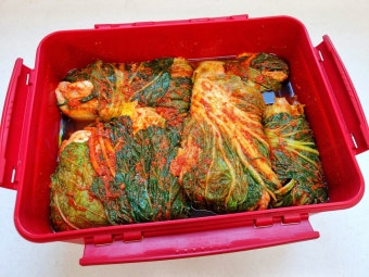 양념소를 다 바른 배추는 속이 빠져나오지 않도록 겉잎으로 잘 감싸준 후, 반으로 살짝 접어 김치통에 차곡차곡 담습니다. 이때 배추의 자른 단면이 위로 오도록 담아야 양념이 빠져나가지 않습니다. 통에 담을 때는 너무 꾹꾹 눌러 담지 말고, 70~80% 정도만 채워주는 것이 좋습니다. 김치가 익으면서 국물이 생기고 부풀어 오를 공간이 필요하기 때문입니다.