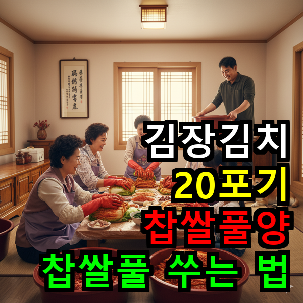 김장 20포기는 꽤 많은 양입니다. 배추 크기에 따라 다르지만, 보통 절인 배추 무게로 약 50kg~60kg 정도를 기준으로 합니다. 이 정도 양의 김치를 버무리기 위해서는 넉넉한 양의 찹쌀풀이 필요합니다.
