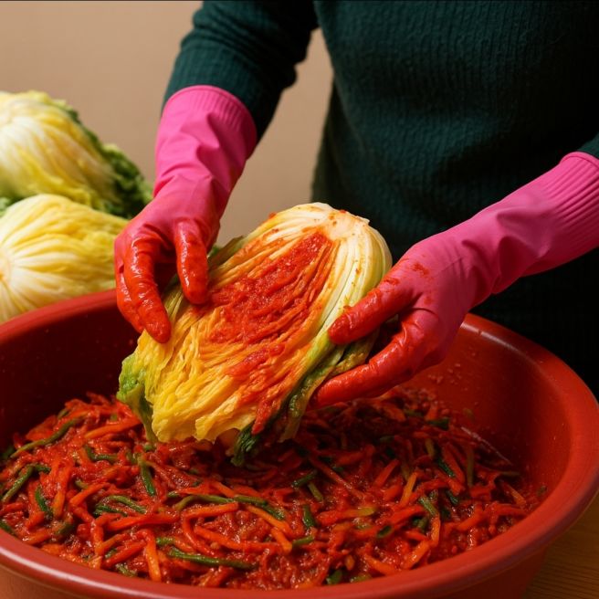 황금 레시피로 만든 김칫소도 중요하지만, 어떻게 보관하고 숙성하느냐에 따라 1년 뒤의 맛이 달라집니다. 김칫소를 버무린 절임배추에 꼼꼼히 채워 넣는 것이 첫 번째입니다. 🥬 배추 겉잎(푸른 잎)으로 김치 포기를 감싸서 김치통에 차곡차곡 담습니다.