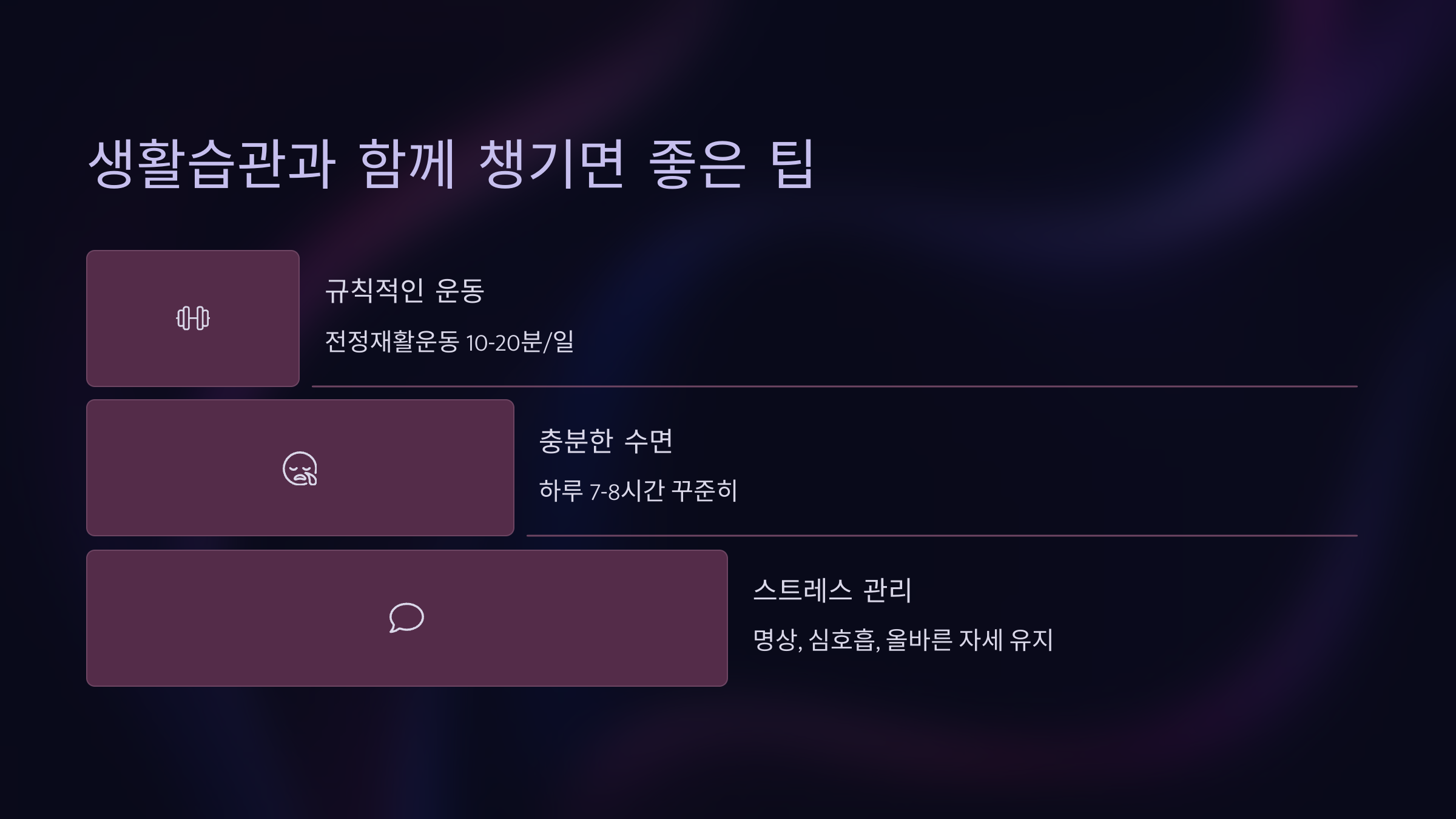 | 스트레스 | 이완, 취미 활동 | 명상, 요가 추천 |