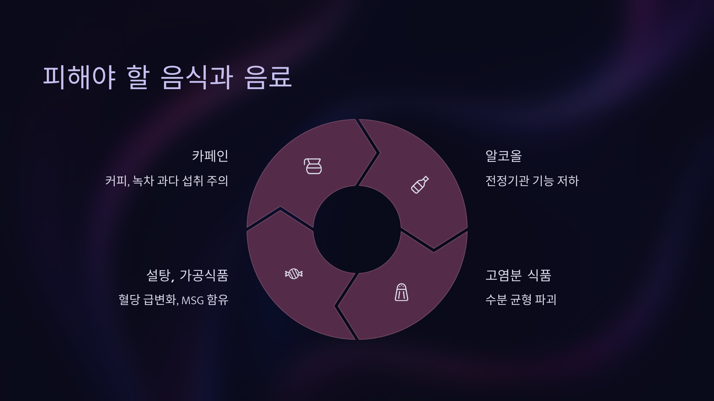 어지럼증을 완화하고 싶은데 아무리 좋은 음식을 먹어도 해로운 음식이 함께 섭취되면 효과가 반감돼요. 그래서 좋은 걸 먹는 것만큼 나쁜 걸 피하는 것도 중요해요. 특히 카페인, 알코올, 나트륨 과다 음식은 주의가 필요해요.
