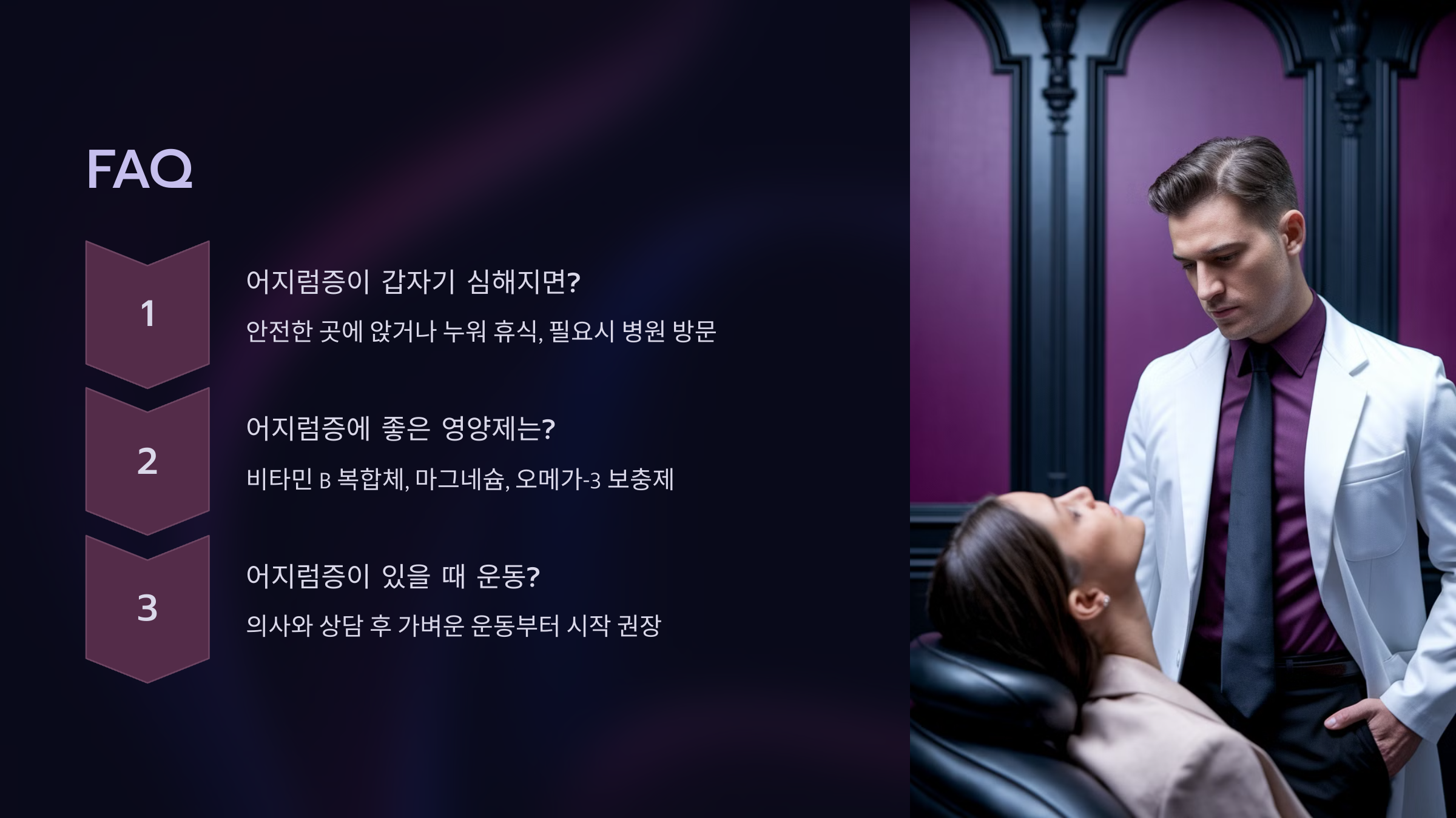 세 번째는 스트레스 관리예요. 스트레스가 심하면 자율신경계가 흔들려서 어지럼증이 유발될 수 있어요. 명상, 가벼운 운동, 산책, 요가, 독서 같은 것으로 마음을 안정시켜 보세요. 일상에 여유가 필요해요.