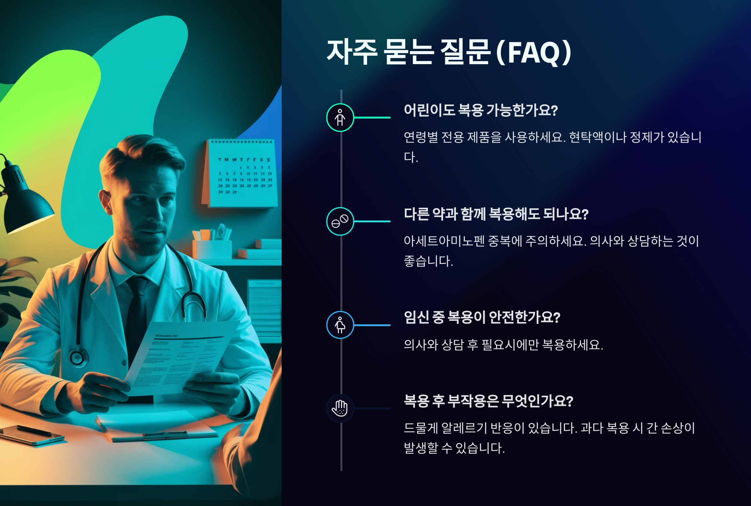 아세트아미노펜은 위장장애를 거의 일으키지 않기 때문에 위염이나 위궤양 환자도 비교적 안전하게 복용할 수 있어요. 또 임산부에게도 사용할 수 있는 몇 안 되는 진통제 중 하나예요. 다만, 간에서 대사되기 때문에 간 건강에 문제가 있다면 복용 전 반드시 의사와 상담해야 해요.