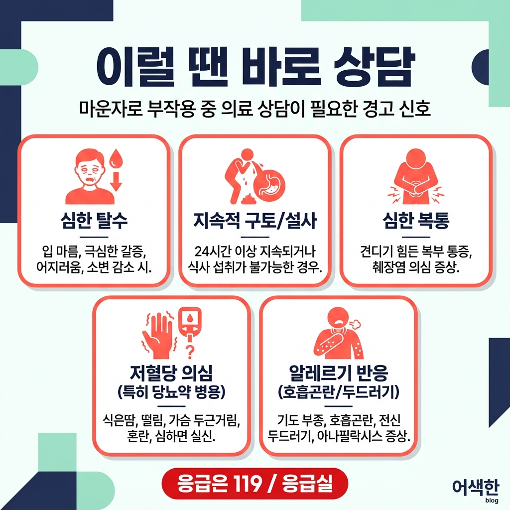 심한 탈수, 지속적 구토/설사, 심한 복통, 저혈당 의심, 알레르기 반응 같은 경고 신호가 있으면 즉시 상담이 필요합니다. 응급 상황이면 119/응급실이 우선입니다. 🚨