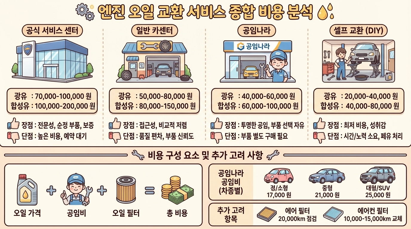 엔진오일 교환 비용은 오일 가격과 공임비로 구성됩니다 교환 장소에 따라 총 비용이 크게 달라지므로 미리 비교해보는 것이 좋습니다 일반적으로 공식 서비스센터가 가장 비싸고 공임나라 같은 프랜차이즈가 가장 저렴합니다