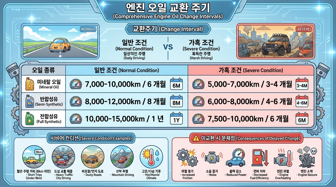 엔진오일 교환주기는 오일 종류와 주행 조건에 따라 달라집니다 합성유는 광유보다 내구성이 좋아 교환주기가 깁니다 일반적으로 합성유는 10,000km에서 15,000km 또는 1년 중 먼저 도래하는 시점에 교환하는 것을 권장합니다