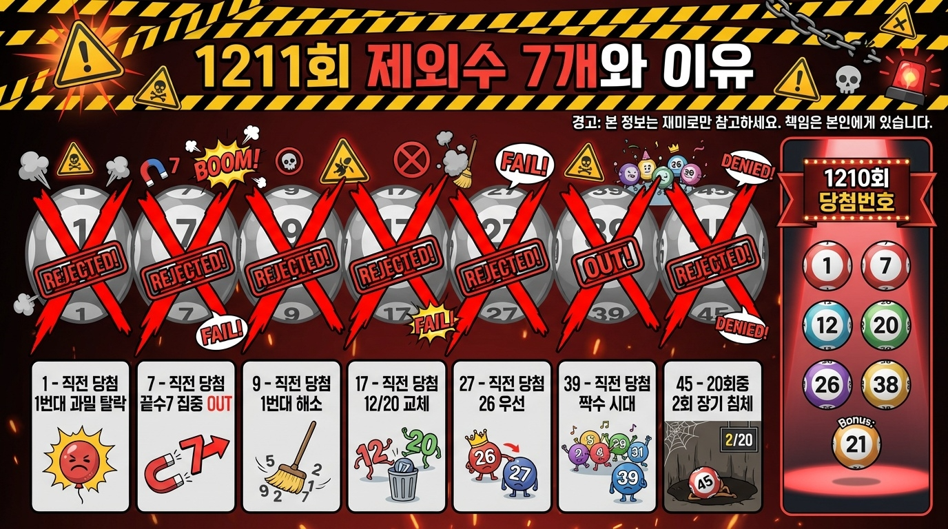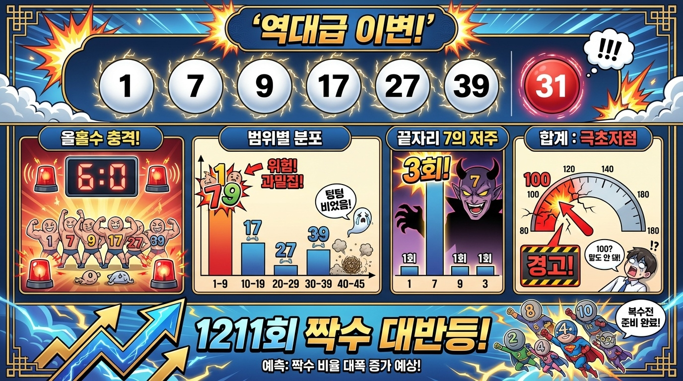 제1211회 로또 6/45 추첨이 2026년 2월 14일로 다가왔습니다! 직전 1210회에서는 1, 7, 9, 17, 27, 39라는 파격적인 올홀수 조합이 출현하며 많은 복권 팬들을 놀라게 했는데요. 보너스번호 31까지 홀수로 나오면서 역대급 이변을 기록했습니다. 이번 글에서는 1210회 결과를 철저히 분석하고 짝수 대반등이 예상되는 1211회 맞춤 전략을 세워봤습니다. 고정수 8개와 제외수 7개를 선별하고 다양한 패턴을 적용한 10조합을 준비했으니 행운의 주인공이 되어보세요! 🍀