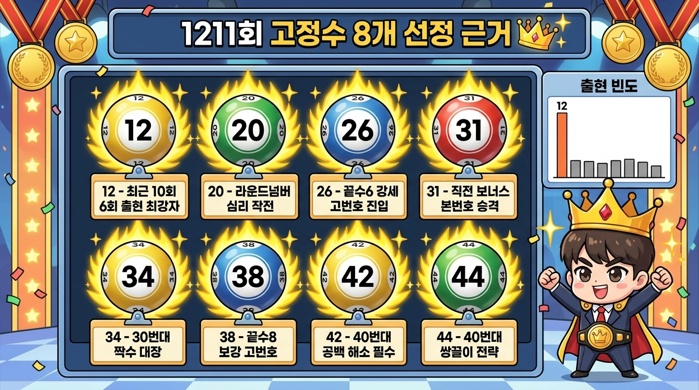 고정수는 당첨 확률이 높다고 분석되어 조합에 우선 배치하는 핵심 번호입니다. 1210회 올홀수 이후 짝수 폭발이 예상되므로 짝수 위주로 고정수를 구성했습니다. 동시에 40번대 공백 해소와 고번호 보강에 초점을 맞췄습니다. 💪