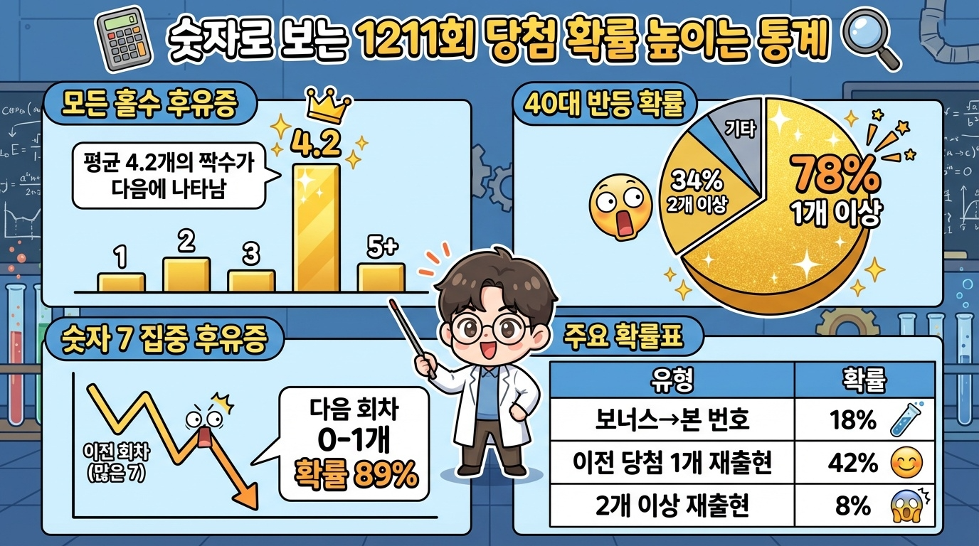 올홀수 출현 후에는 짝수가 평균 4.2개 등장하는 강력한 반동 효과가 있기 때문입니다. 이는 단순한 추측이 아닌 역대 데이터 분석 결과입니다. 짝수 중심 전략이 1211회에서는 가장 합리적입니다.