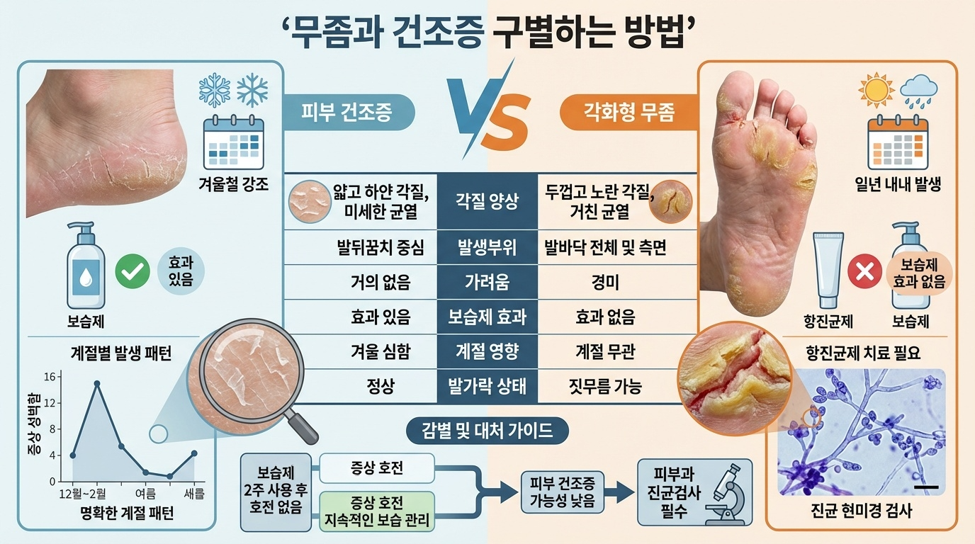 건조증은 얇고 하얀 각질이 발뒤꿈치 중심에 생기고 보습제로 호전됩니다. 무좀은 두껍고 노란빛 각질이 발바닥 전체로 퍼지며 보습제로 호전되지 않습니다. 정확한 진단을 위해서는 피부과에서 진균 검사를 받아야 합니다.