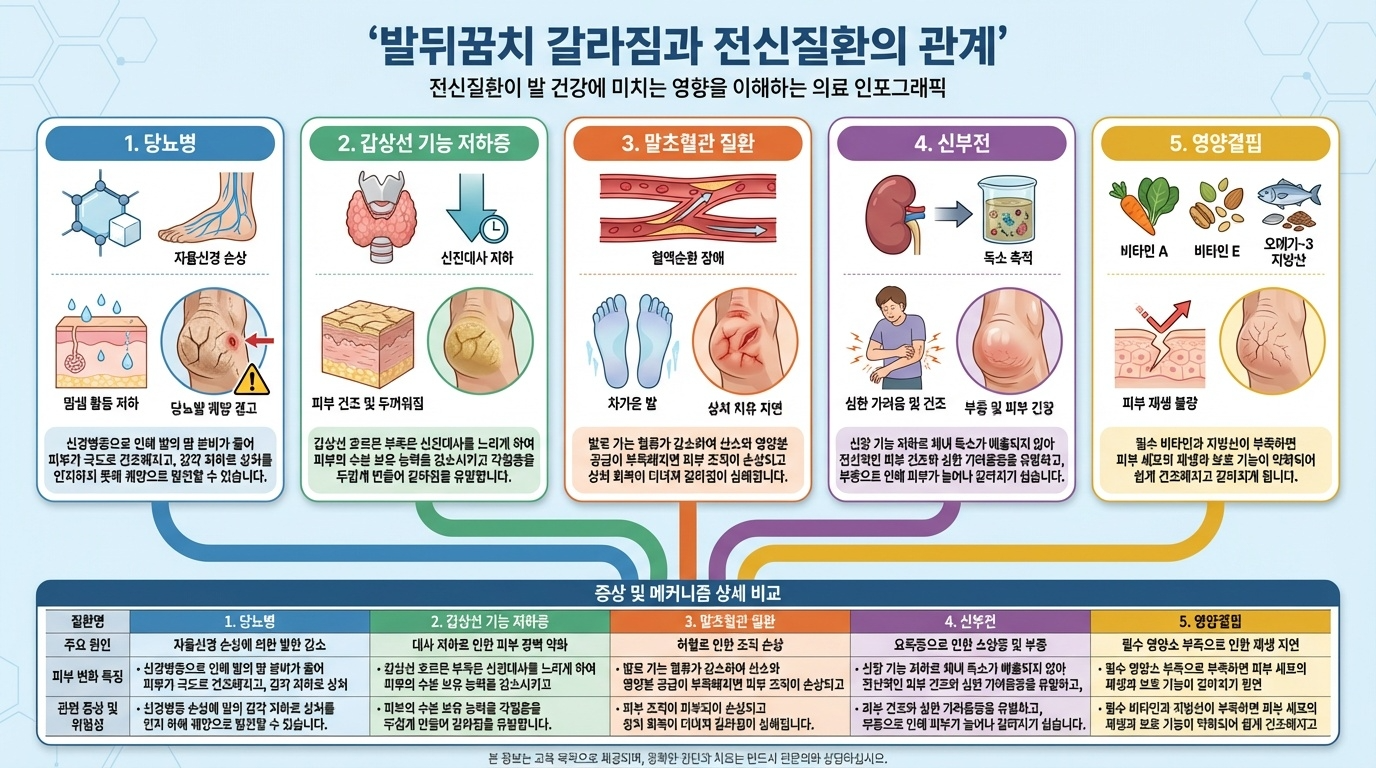 다섯 번째는 전신 질환의 신호입니다. 당뇨병, 갑상선 기능 저하증, 류마티스 관절염, 신부전, 영양 결핍 등 전신 질환이 발뒤꿈치 갈라짐으로 나타날 수 있습니다. 특히 당뇨병 환자는 신경병증으로 인해 땀이 잘 나지 않아 피부가 심하게 건조해지고 갈라지는 증상이 일반인보다 훨씬 심하게 나타납니다.