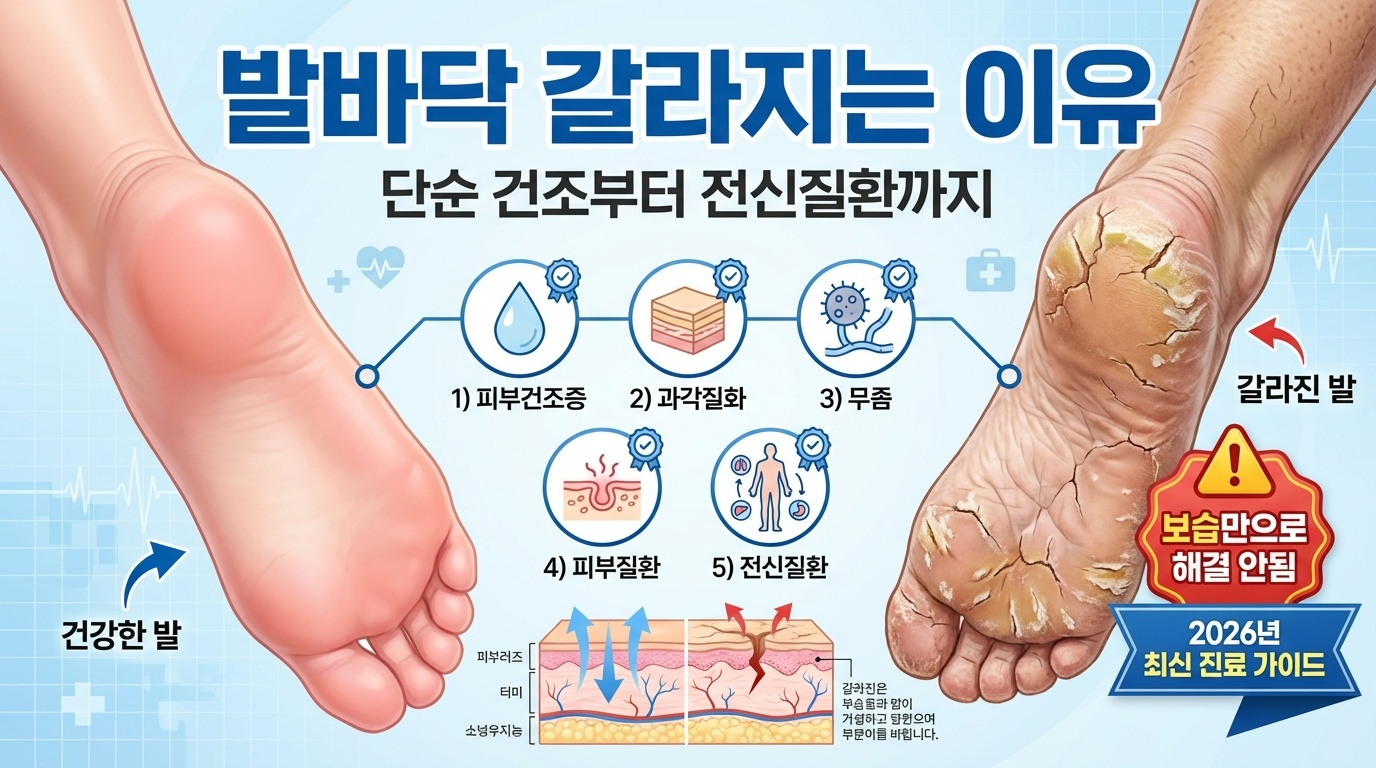 발바닥이 쩍쩍 갈라지는 경험, 한 번쯤 해보셨을 거예요. 😥 단순히 건조해서 그런 거라고 생각하기 쉽지만, 사실 발바닥 갈라짐은 다양한 원인에서 비롯됩니다. 피부 건조증부터 무좀, 건선 같은 피부 질환, 심지어 당뇨병이나 갑상선 기능 저하증 같은 전신 질환의 신호일 수도 있습니다. 보습제만 열심히 바르는데도 낫지 않는다면, 지금부터 알려드리는 원인과 해결법을 꼼꼼히 확인해 보세요.