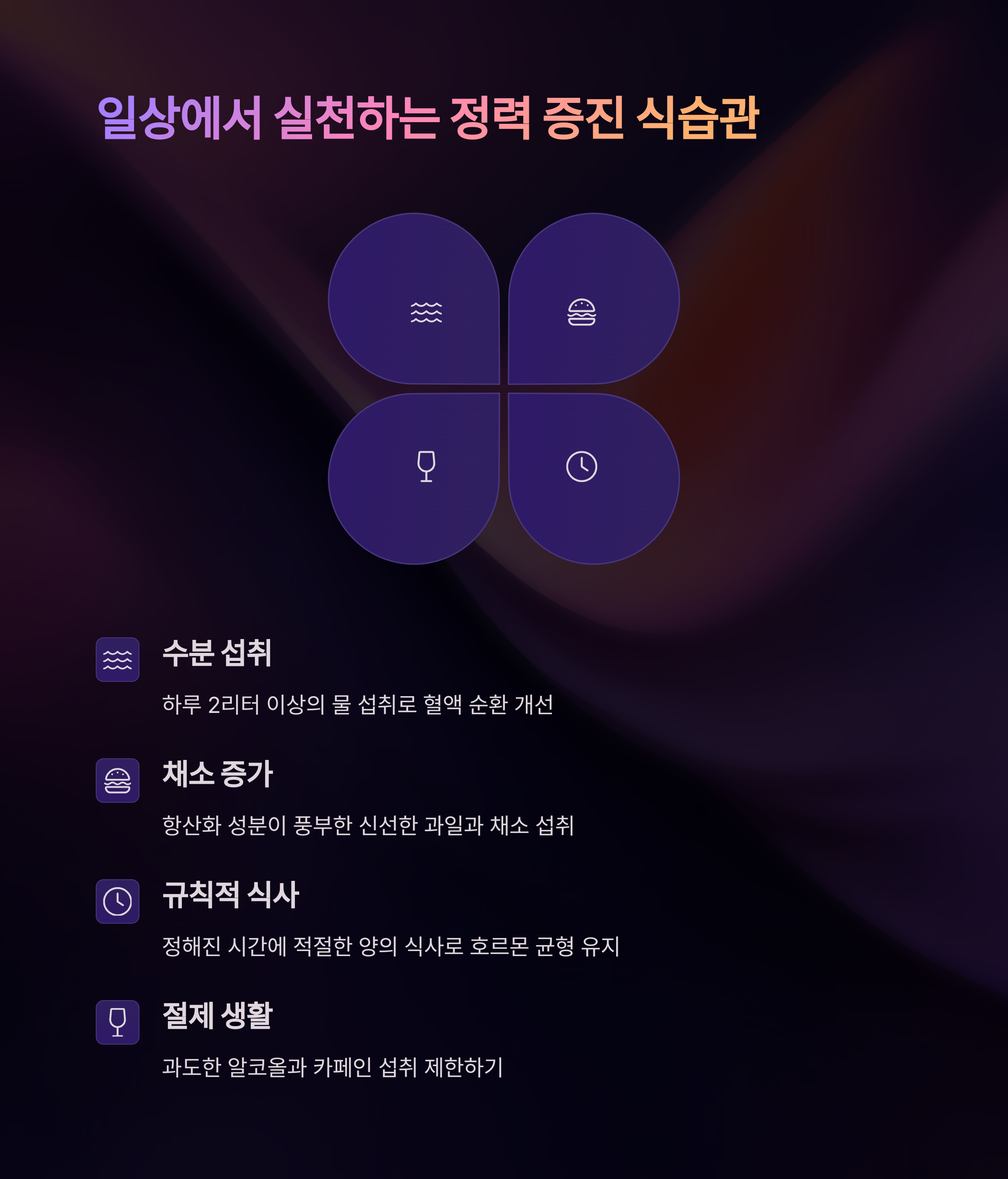 A7. 규칙적인 수면, 스트레스 관리, 건강한 식습관이에요. 여기에 운동과 수분 섭취를 더하면 자연스럽게 정력도 향상돼요.