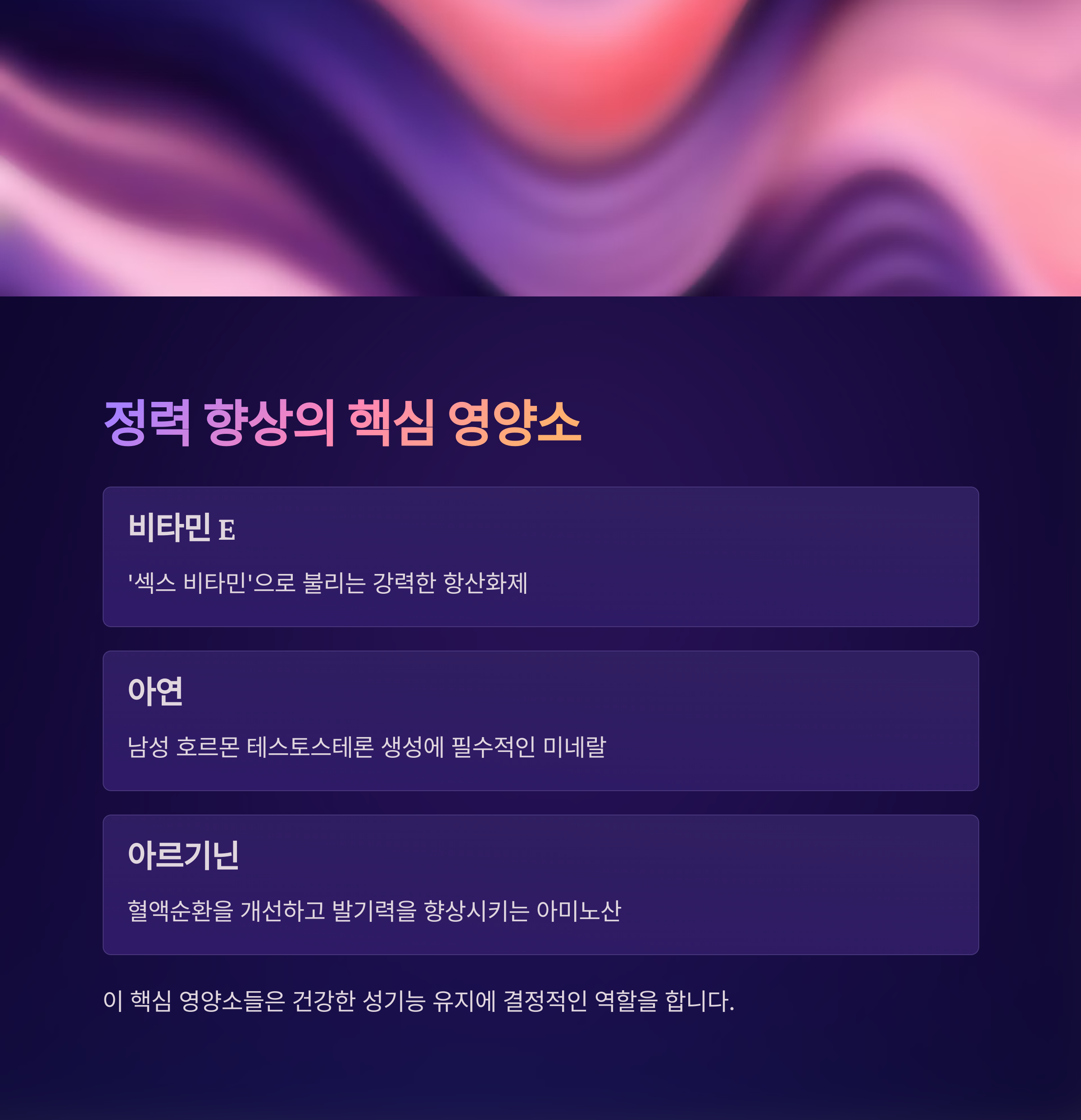 정력에 도움이 되는 영양소는 꽤 다양해요. 그 중 가장 핵심이 되는 성분은 바로 '아연'이에요. 아연은 테스토스테론 생성에 직접 관여하고, 정자 생성과 품질 유지에 필수적이죠. 굴, 소고기, 호박씨에 많이 들어 있어요.