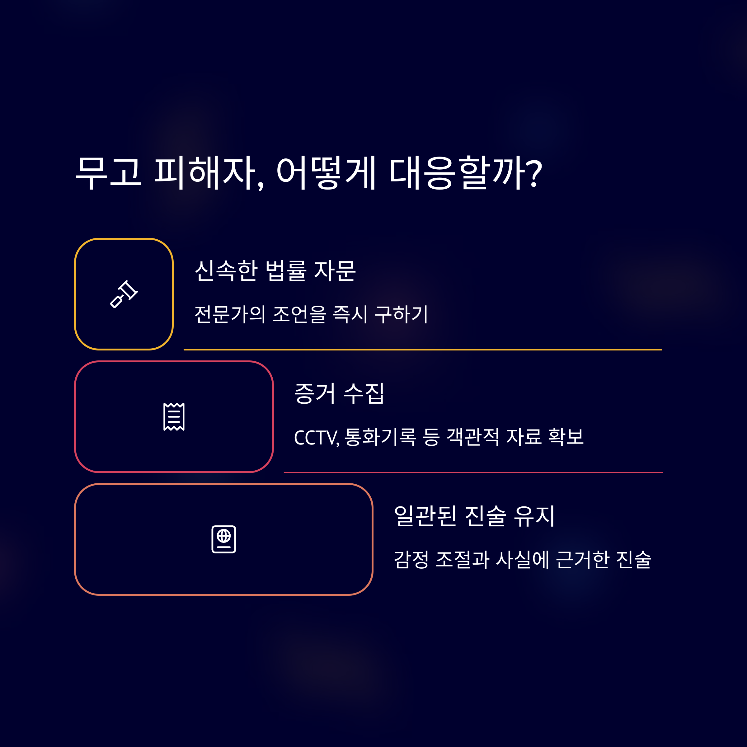 | 3단계: 수사 대응 | 진술 연습 및 서류 제출 | 과장·감정표현 삼가 |