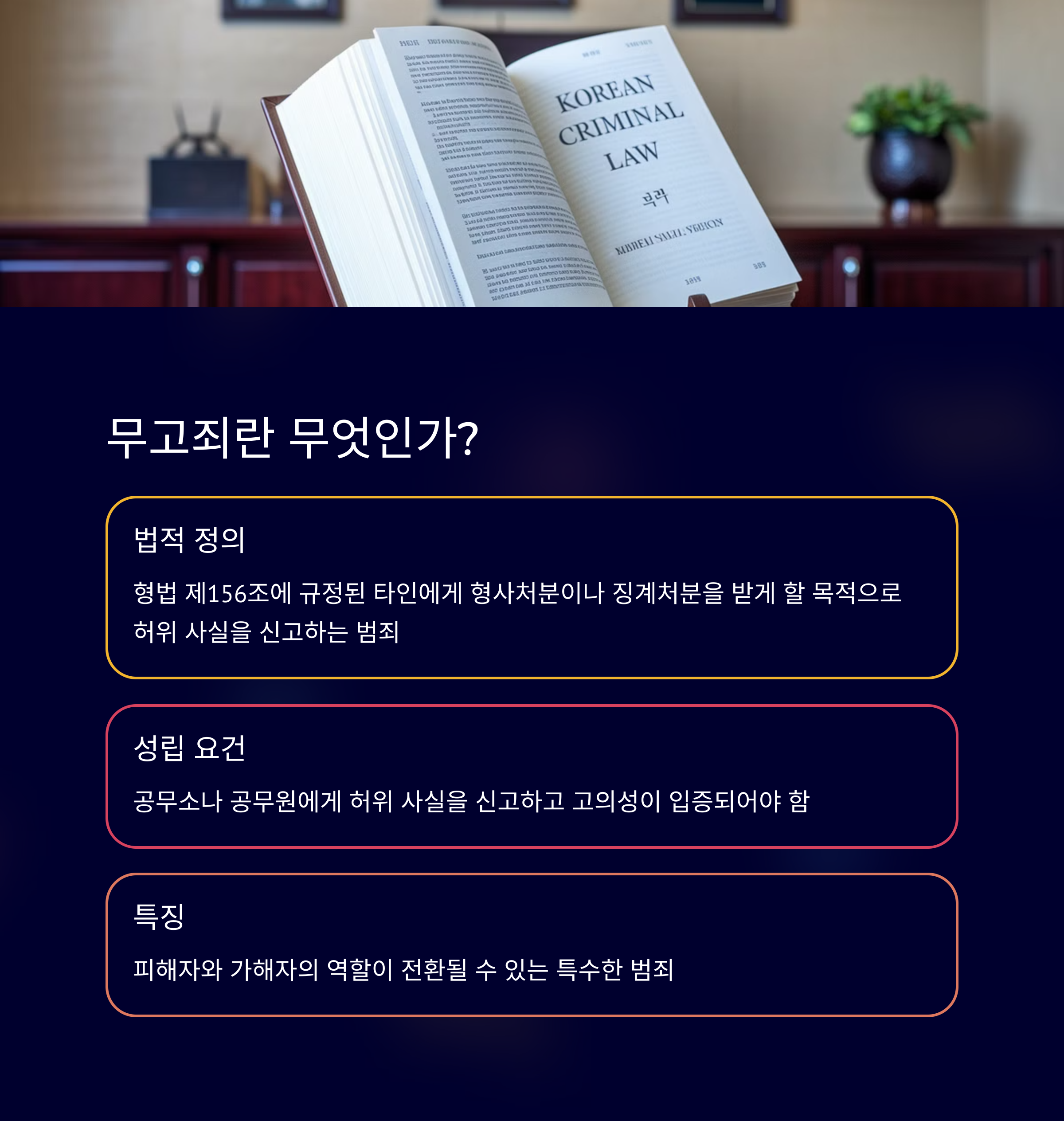 지금부터 무고죄 성립 요건에 대해 섹션별로 정리할게요! 아래 내용은 3개 박스로 나뉘어 출력되며, 각 문단에는 실질적인 사례와 법률적 정보가 포함돼 있어요.