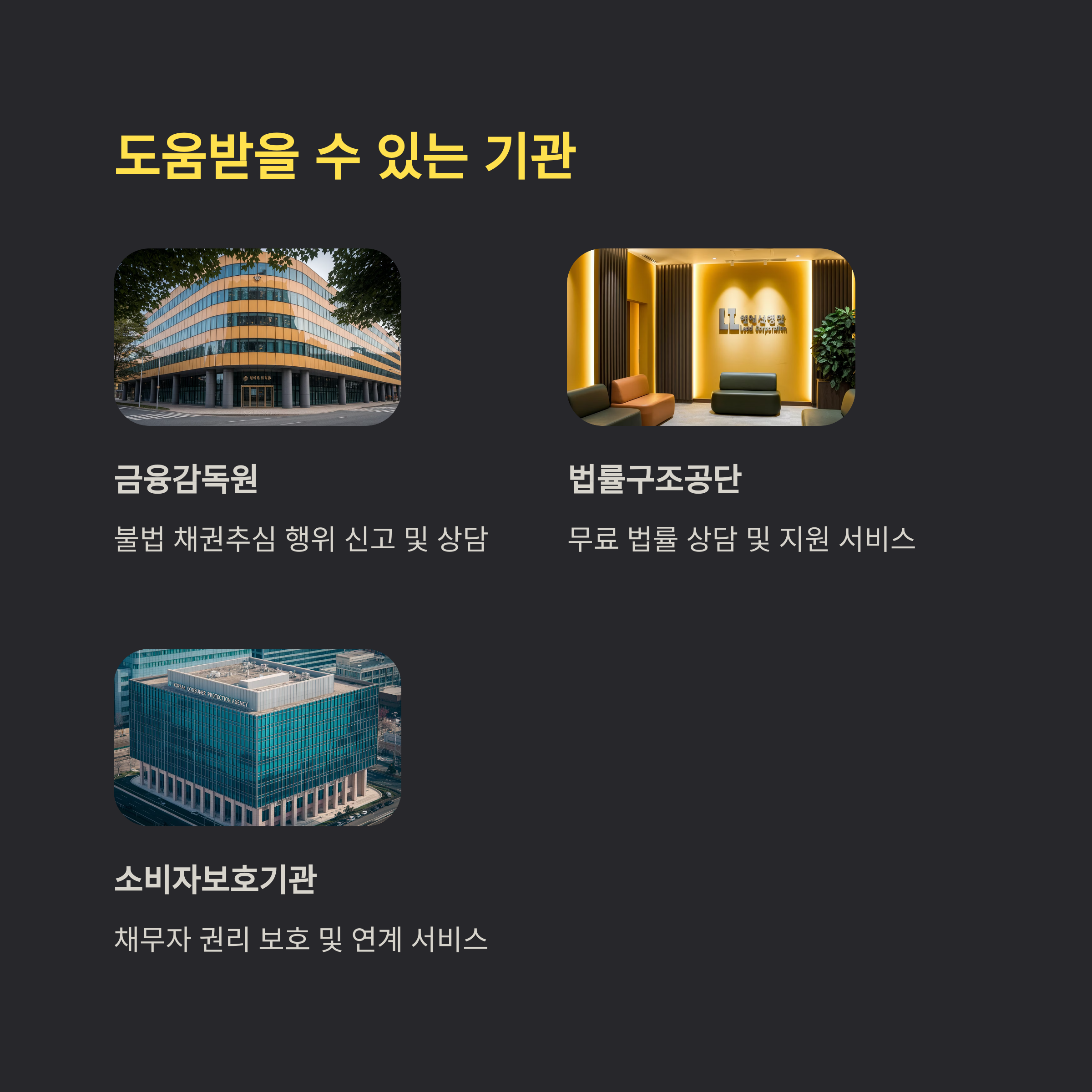 불법추심 피해를 입은 경우, 금융감독원(☎1332), 한국소비자원, 또는 국민신문고에 민원을 제기하면 즉시 조사와 시정 조치가 들어가요. 절대 혼자서 끙끙 앓지 마세요.