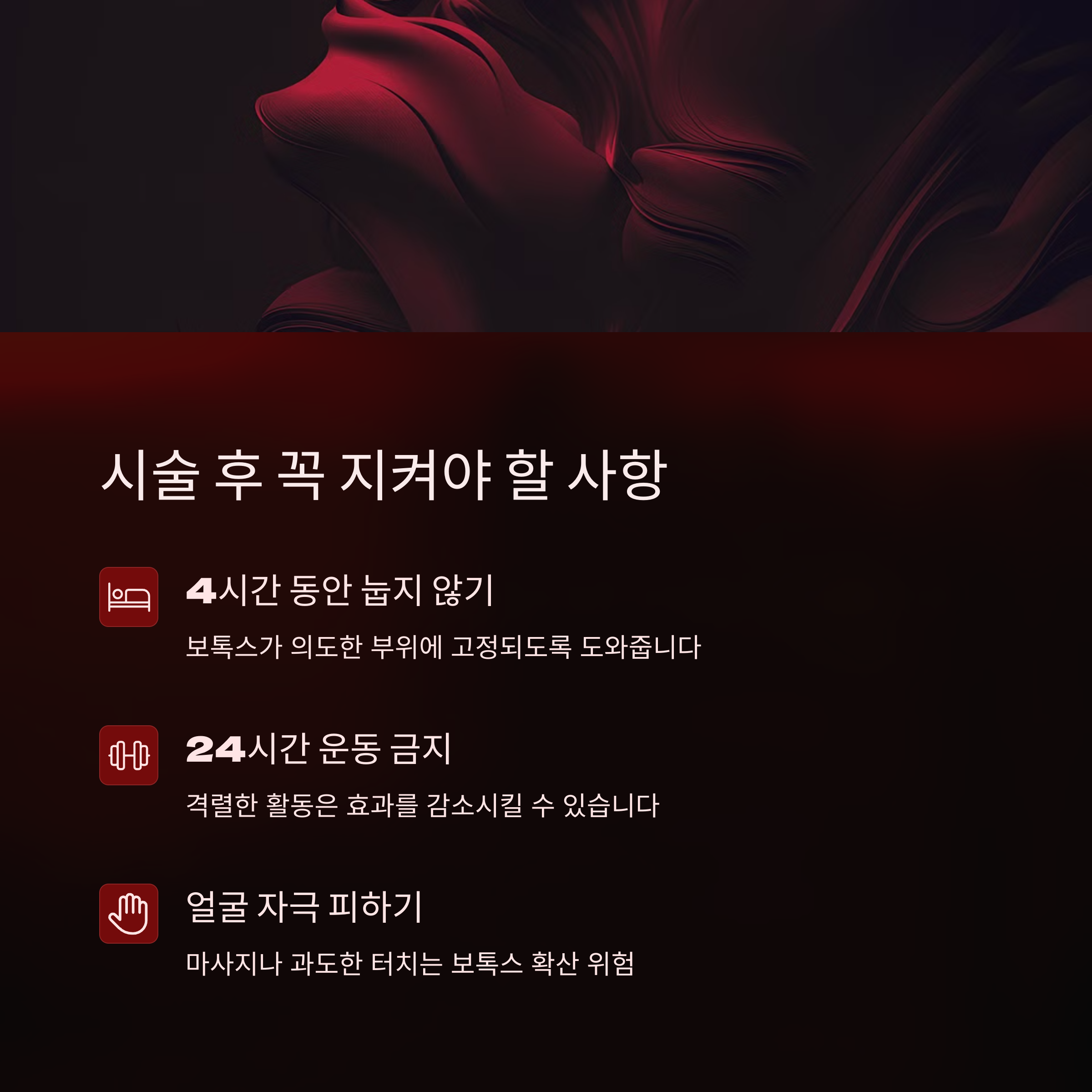 보톡스 효과를 극대화하고 부작용을 최소화하려면 시술 후 관리가 중요해요. 몇 가지 생활 습관을 지키는 것만으로도 훨씬 안정적으로 회복할 수 있답니다.