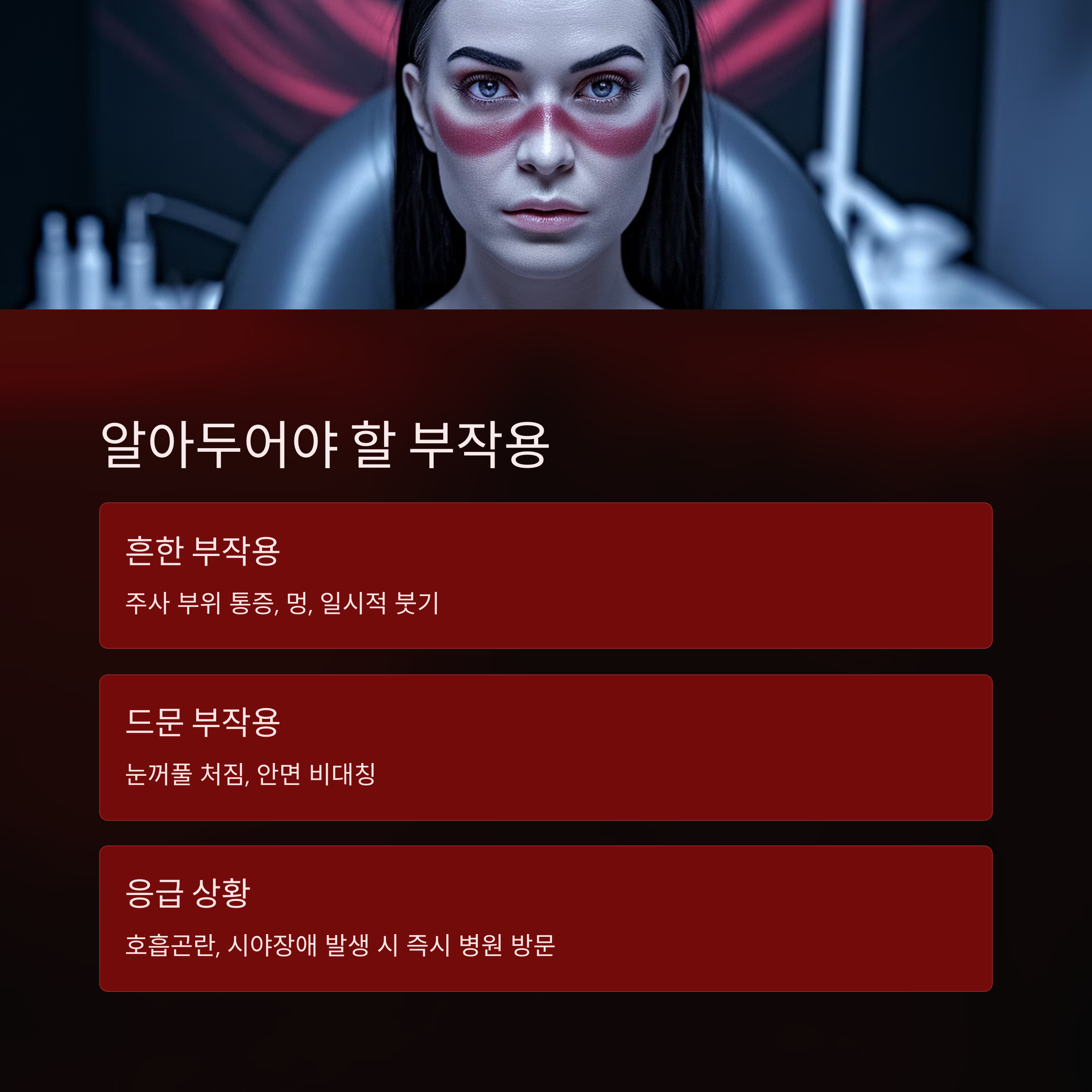 ✔ 보톡스에 알레르기 반응이 있었던 경우, 반드시 과거 병력을 알려야 해요. 드물지만 아나필락시스 같은 심각한 반응이 있을 수 있어요.