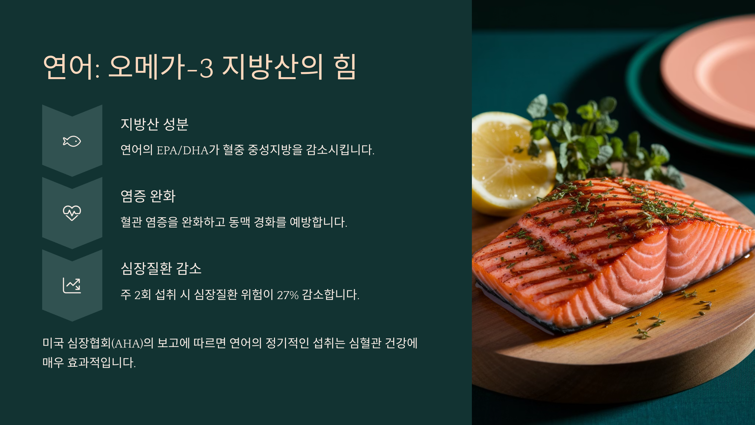 연어는 혈관 건강에 정말 좋은 대표적인 생선이에요. 그 이유는 바로 풍부한 오메가-3 지방산 덕분인데요, 이 지방은 혈액 속의 중성지방을 낮추고 혈전을 예방해줘서 심장 질환의 위험을 크게 줄여줘요. 실제로 미국심장협회(AHA)에서는 심장 건강을 위해 주 2~3회 연어 섭취를 권장하고 있을 정도예요.