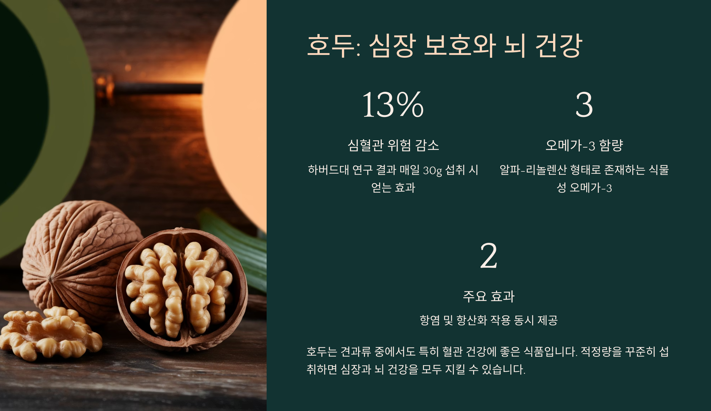 호두는 꾸준히 섭취하면 심혈관 건강은 물론, 두뇌 기능과 노화 방지에도 도움을 줘요. 아침, 점심, 저녁 간식으로 적당량씩 챙겨 먹는 습관을 들이면 하루가 든든해질 거예요!