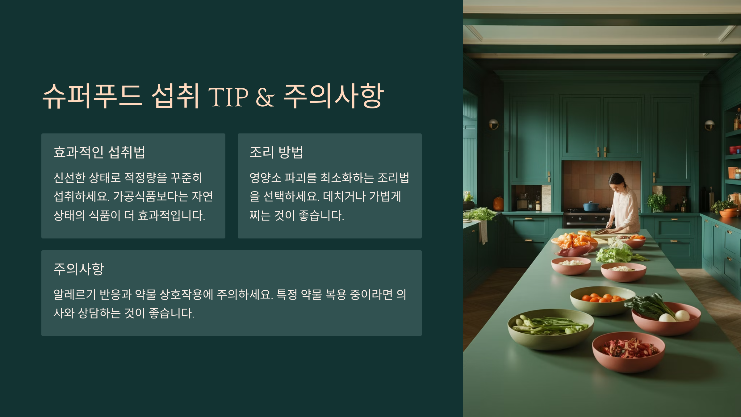 A2. 슈퍼푸드는 소량으로도 충분한 효과가 있어요. 예를 들어 블루베리는 한 줌, 호두는 7~9알, 연어는 주 2~3회가 적정량이에요.
