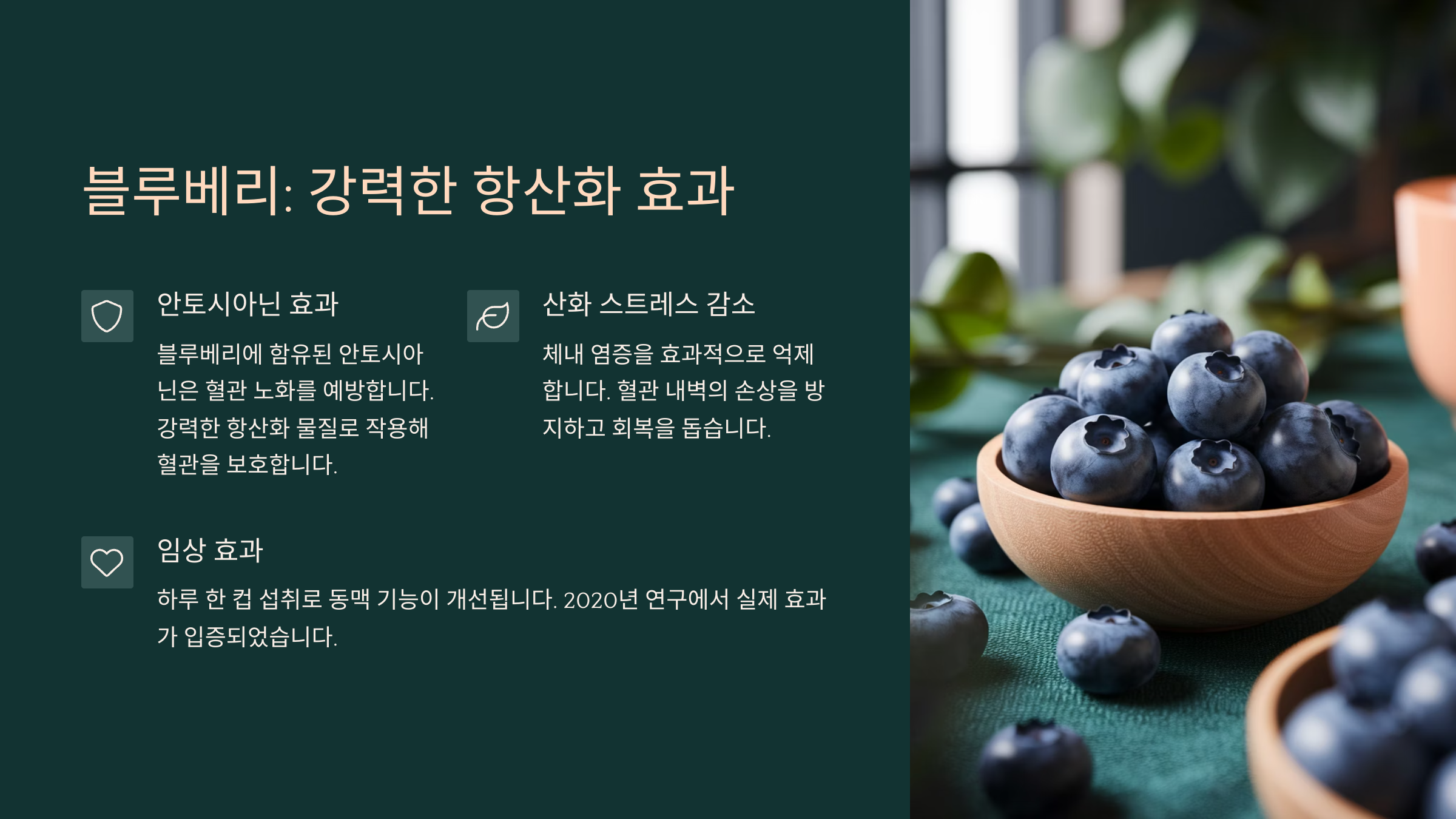 | 안토시아닌 | 항산화 작용, 혈관 보호 | 생으로, 스무디로, 요거트에 | 냉동 보관 가능 |