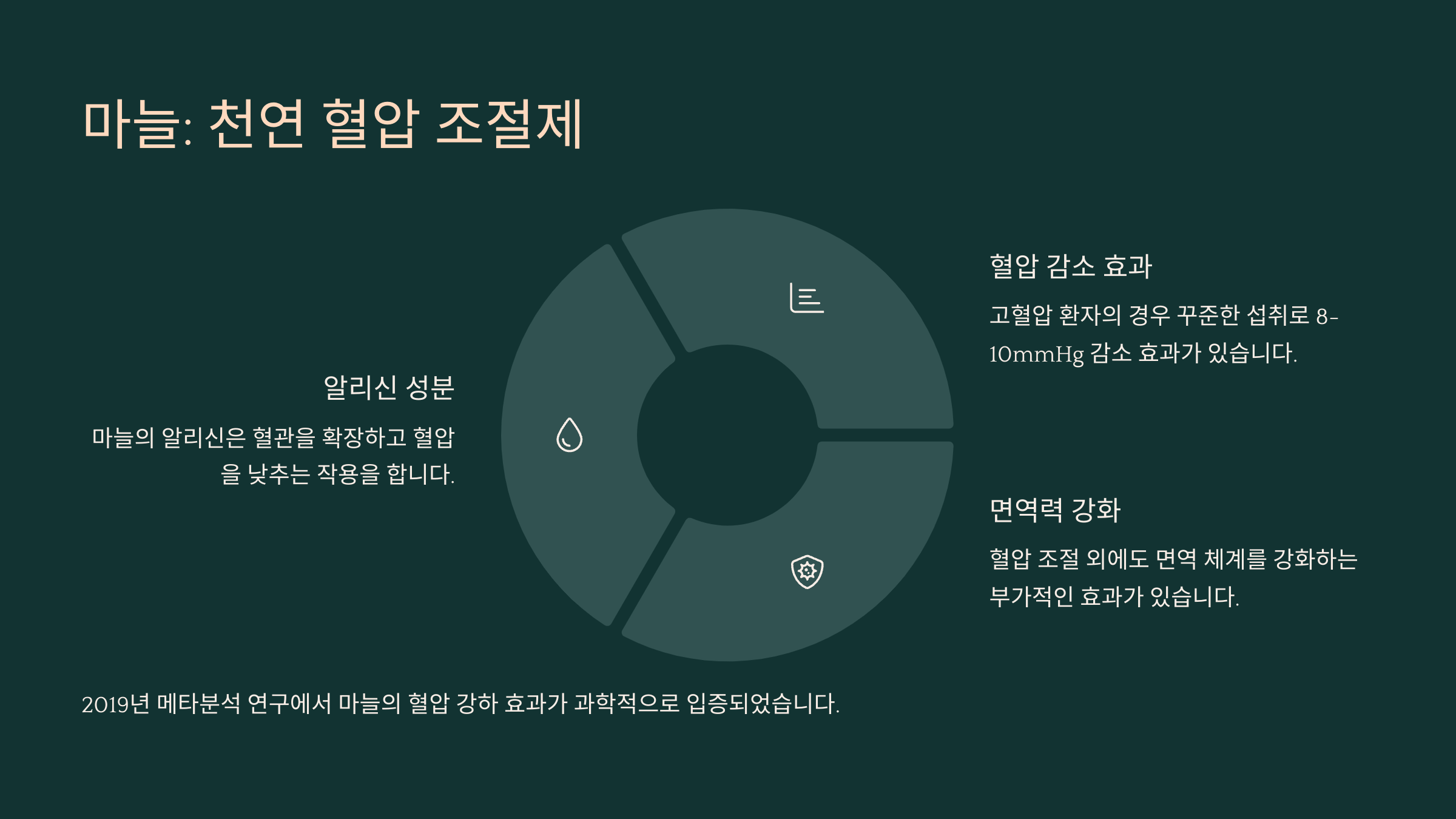 한 연구에 따르면 매일 마늘 보충제를 섭취한 성인들은 평균 수축기 혈압이 약 10mmHg, 이완기 혈압은 약 8mmHg 감소하는 결과를 보였어요. 고혈압이 있는 사람이라면 약간 매운 맛이 있더라도 꾸준히 먹는 걸 추천해요.